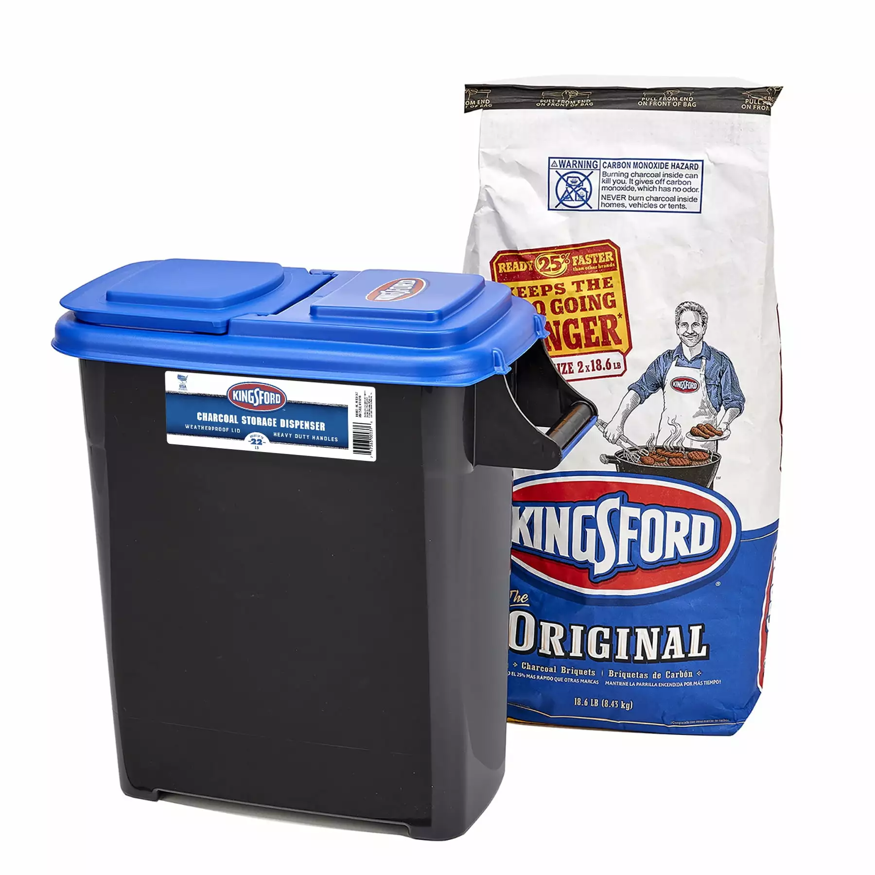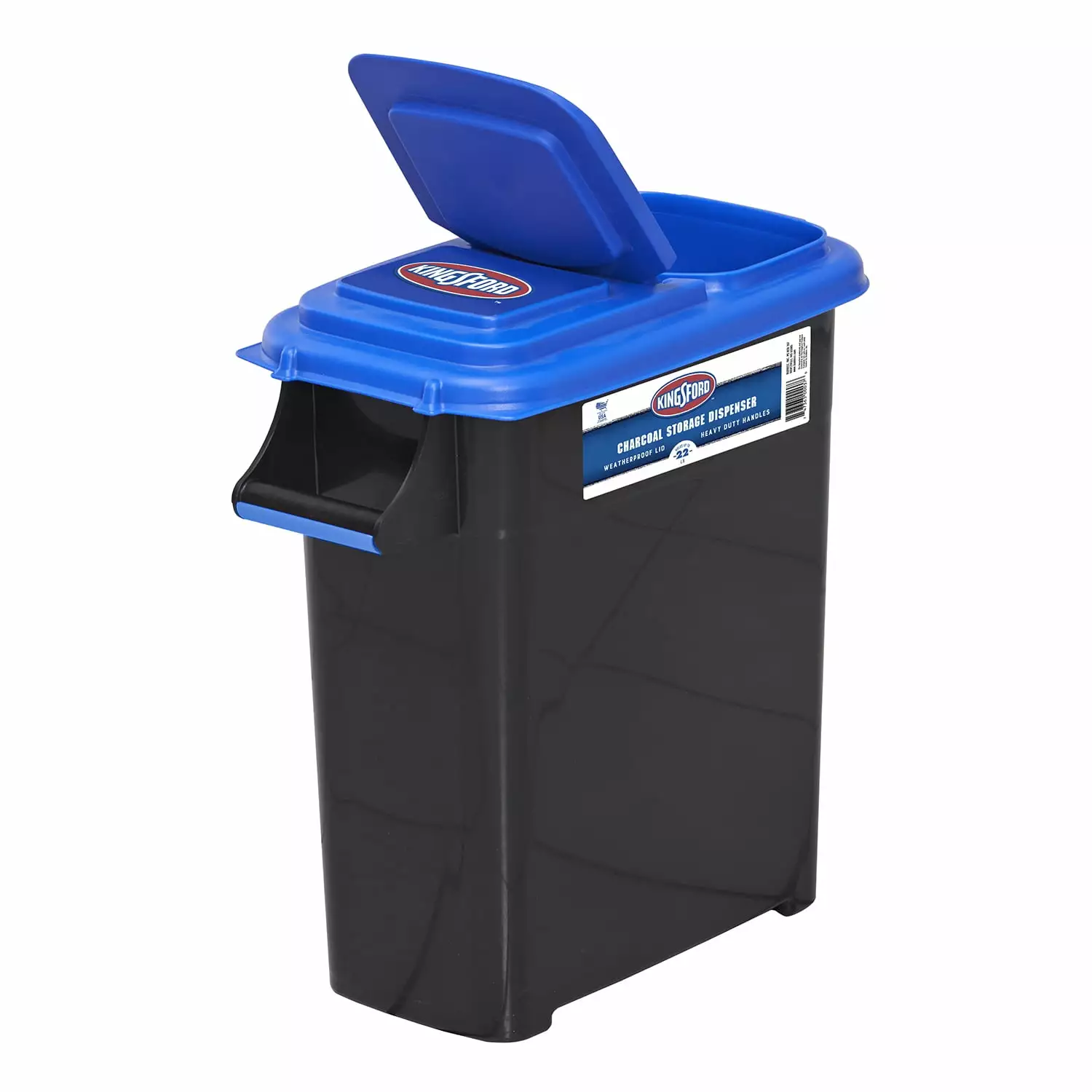 The Kingsford 8 Gallon Charcoal Dispenser in black with blue lid is a must-have for any grilling enthusiast. This dispenser is designed to make the process of handling charcoal convenient and mess-free. With a generous capacity of up to 24 lbs. and measuring 11" x 19" x 20". it ensures you have an ample supply of charcoal for your grilling sessions. The sturdy construction and secure lid help keep the charcoal dry and ready for use. The dispenser’s 8-gallon size strikes the perfect balance between storage capacity and portability. making it easy to transport and store.