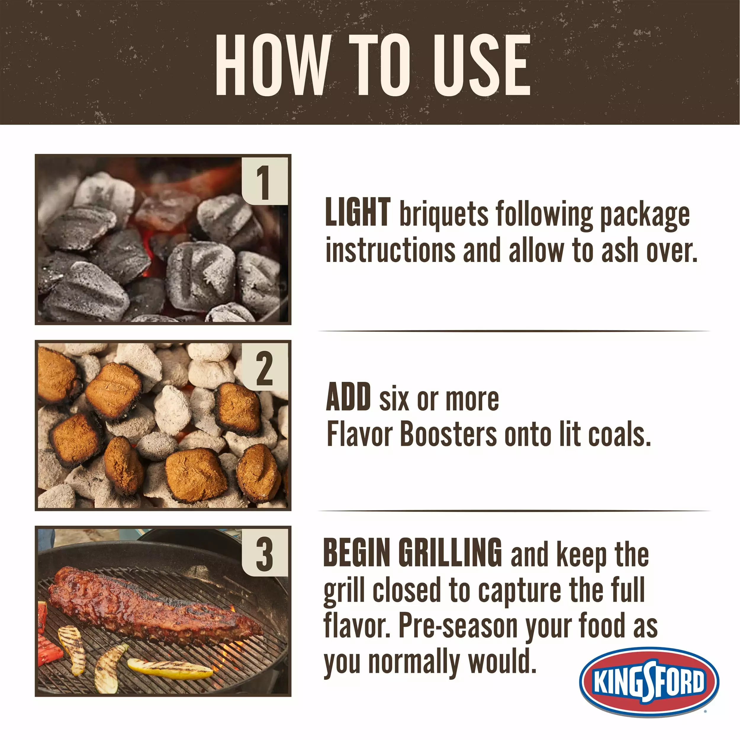 Easy to Add to Any Charcoal Grill: 1. Start your grill. 2. Add flavor boosters to your charcoal. 3. Enjoy the flavor. Directions: 1. Light pile of Kingsford charcoal briquets following package instructions and allow to ash over. 2. Place 6 or more Kingsford signature flavor boosters onto lit coals and replace grill grate. To increase smoke intensity. use additional flavor boosters. 3. Add food and keep grill closed to maximize flavor. Season your food with your favorite spices as you normally would.