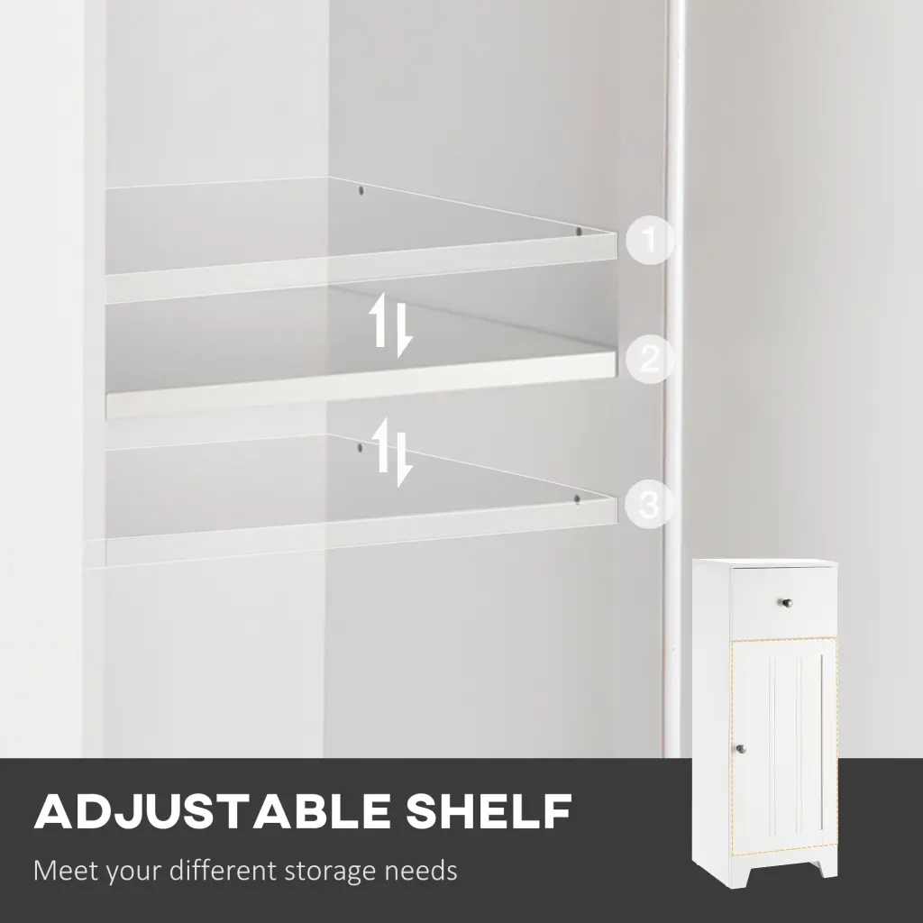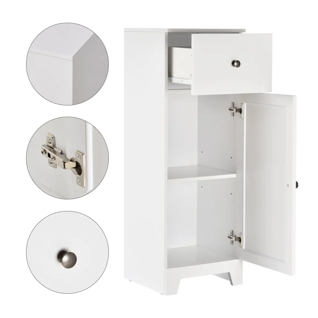 kleankin Short Bathroom Storage Cabinet, Cabinet Arranger with 1 Drawer and Customizable Shelf for Living Room, White Characteristics: Space-saving Footprint: This small bathroom cabinet has a surprisingly large capacity that can fit most corners or narrow spaces in your bathroom. An anti-topping device is included for