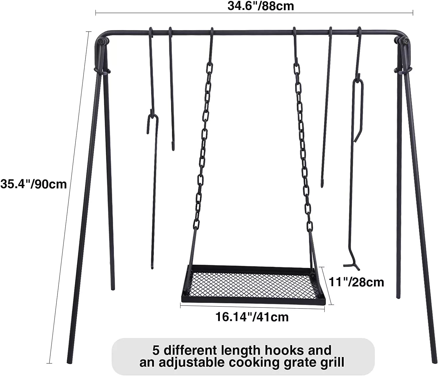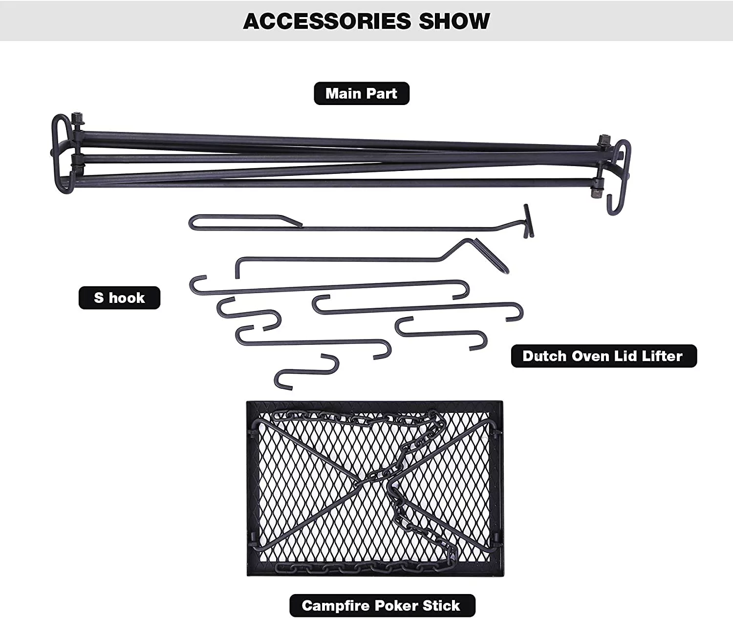 - [Suitable Gift Hook]Each Grill Set includes multiple length hooks made with steel and an adjustable grate grill to hang camping or outdoor kitchenware or any other items. It also comes with a convenient swing tray for over the fire cooking.