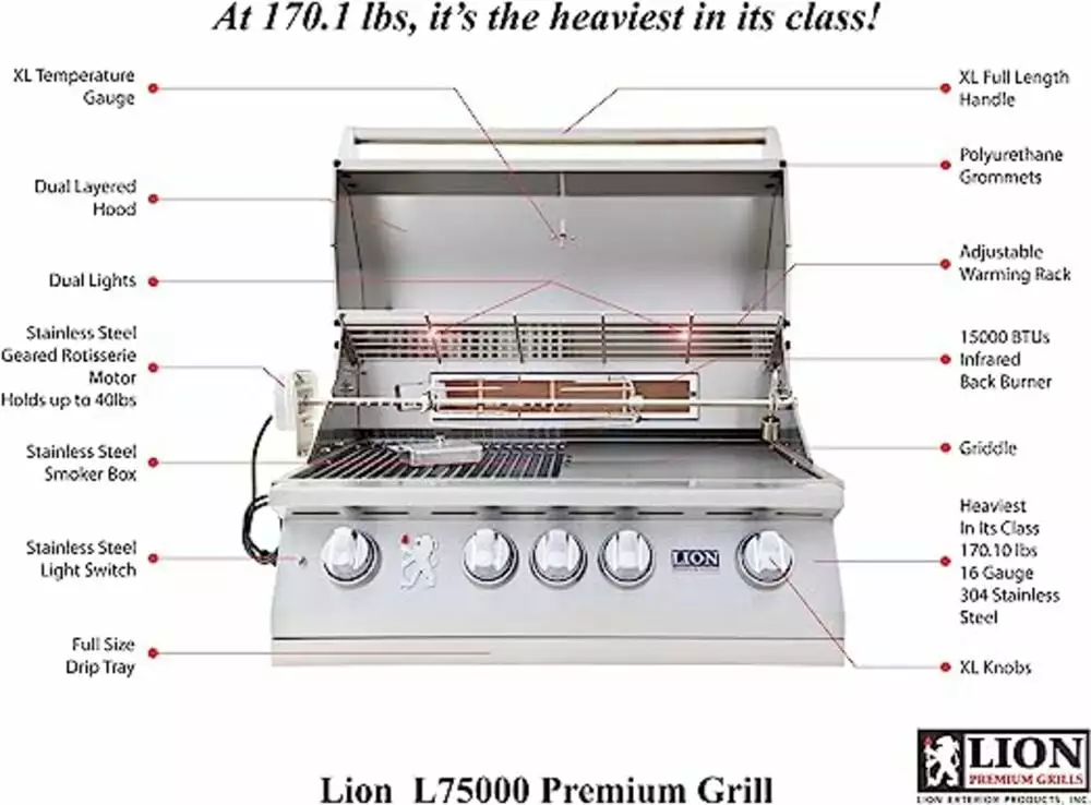 Lion grills come packed with a wide range of features for an amazing grilling experience. The 32" Built-in Propane Grill includes four cast stainless steel burners. halogen light bulbs. and 830 sq. inches of total grilling area. Each burner is capable of up to 15.000 BTUs. combined with the infrared rotisserie back burner this grill can crank the heat up to 75.000 BTUs! Lion also includes a smoker box. griddle plate. rotisserie kit and canvas cover with each grill! The meticulously crafted grill head is made with double-layer seamless welded stainless steel with polished edges. The included canvas cover has soft flannel backing to ensure your valuable steel remains scratch-free. On the inside. the grill has also been equipped with. heat zone separators and interior cooking lights These small features enhance your grill even more by providing even heat distribution and help you see what you’re cooking in low light. Another bonus feature is that the griddle plate remover has a built-in bottle opener! Whether you desire mesquite chicken’s bold taste. applewood-smoked salmon’s delicate smokiness. or a tender. juicy steak. this grill can do it all!