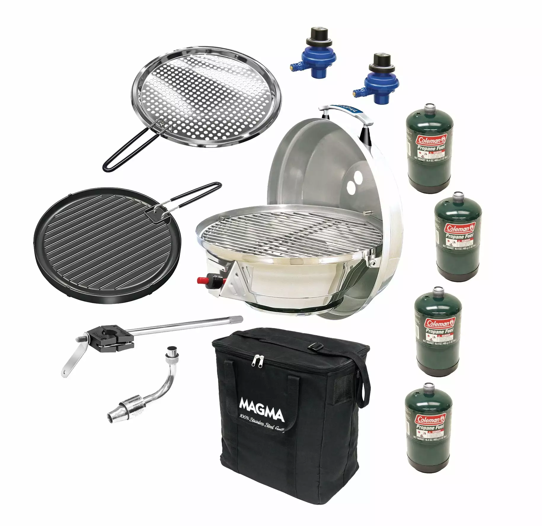 Conveniently store and transport your grill and accessories in Magma’s luggage quality padded carrying/storage case. Designed to conveniently organize. transport. store and protect all of your grilling gear. This case is outfitted with a large main storage compartment for a grill with additional pockets for storing a griddle. fish & veggie grill tray. grill tools. control valve/regulators and up to (4) disposable 1 lb. propane fuel canisters. Additional features like a heavy duty shoulder strap and handles allow for easy use. While the thick padding provides maximum protection of both the grill and boat during transportation and storage. making this convenient case a must have for every grilling enthusiast.