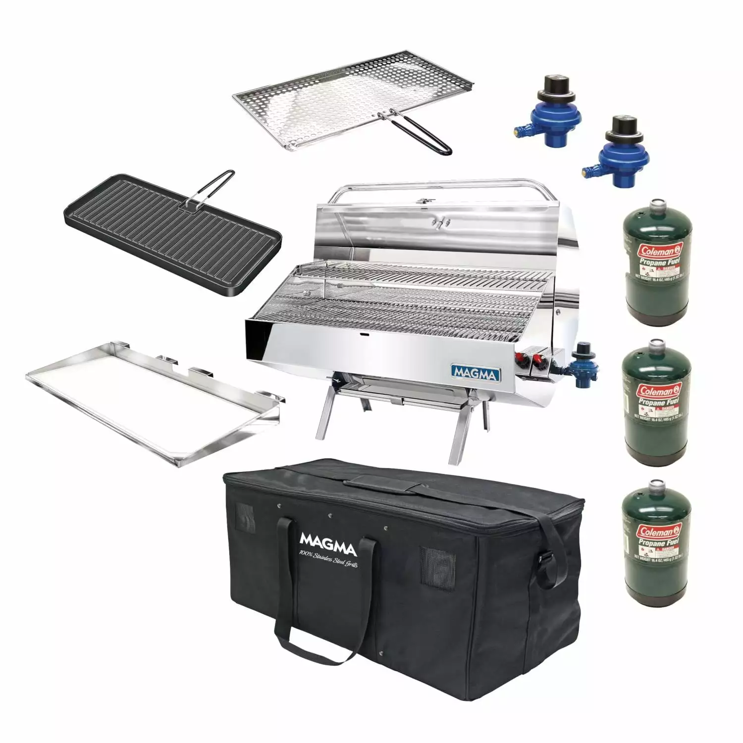 Magma Storage Carry Case Fits 12 x 24 Rectangular Grills Padded Grill & Accessory Carrying/Storage Case. Fits Magma and most portable rectangular grills with these cooking surface sizes: 12 x 24. Conveniently store and transport your grill and accessories in one of Magma’s new padded carrying cases. Designed to store all of your grilling gear in one space saving location. This bag is outfitted with a large storage compartment for a grill. pockets for storing a serving shelf. griddle. fish/ veggie tray. Includes an additional side pocket for storing up to (3) 1lb. propane canisters and (2) control valve/ regulators. Additional features like thick padding for maximum protection and heavy duty carrying handles and strap make this a must have for every grilling enthusiast. With the same quality and craftsmanship you’ve come to expect. once again Magma has just what you’ve been looking for.