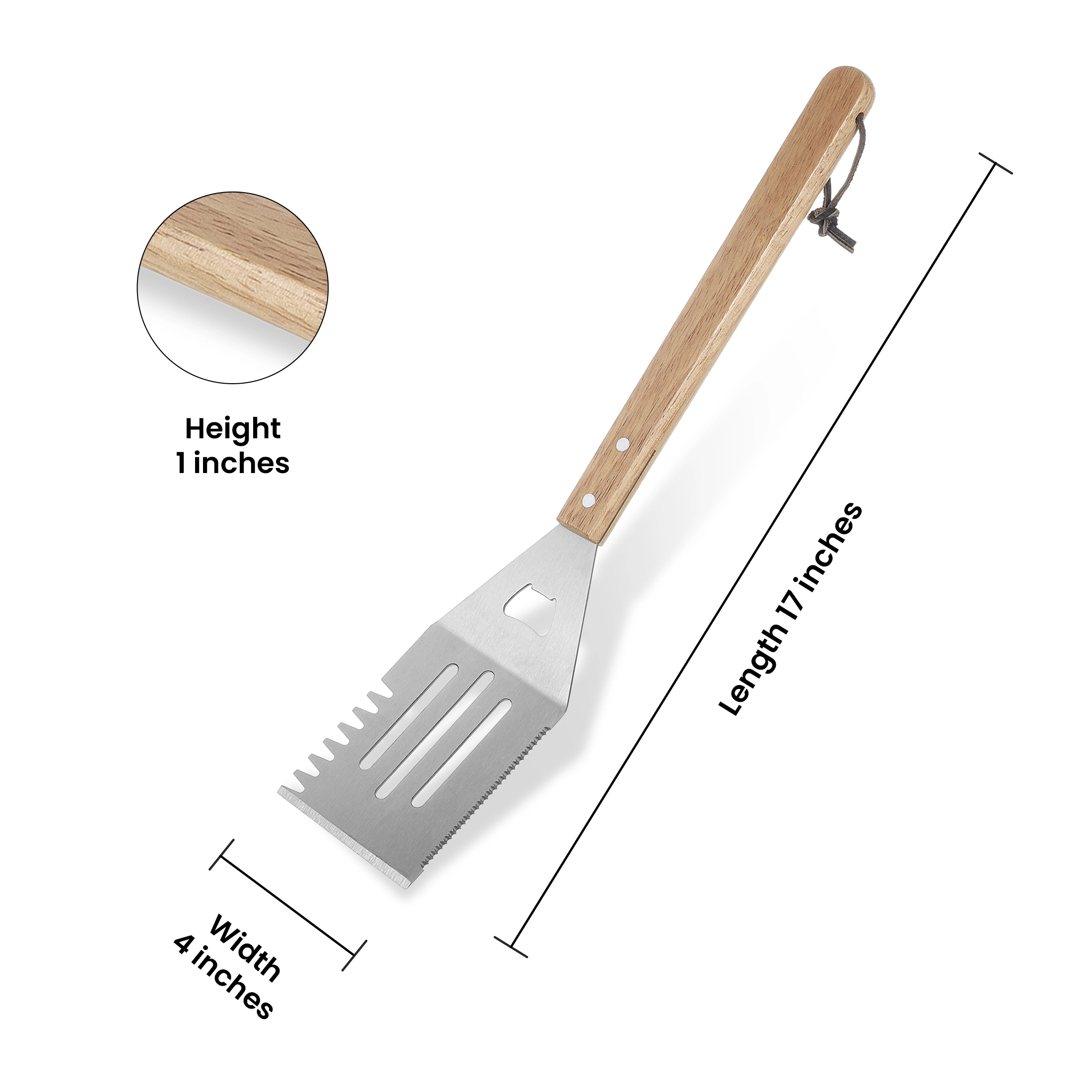 - User-friendly Design: The grilling spatulas are designed from the user’s perspective and have an extended handle. which will enable you to keep a safe distance from the hot grill and minimize the risk of burns. It also has an inbuilt bottle opener and serrated sides making it easy for easy carving. lifting. and serving.