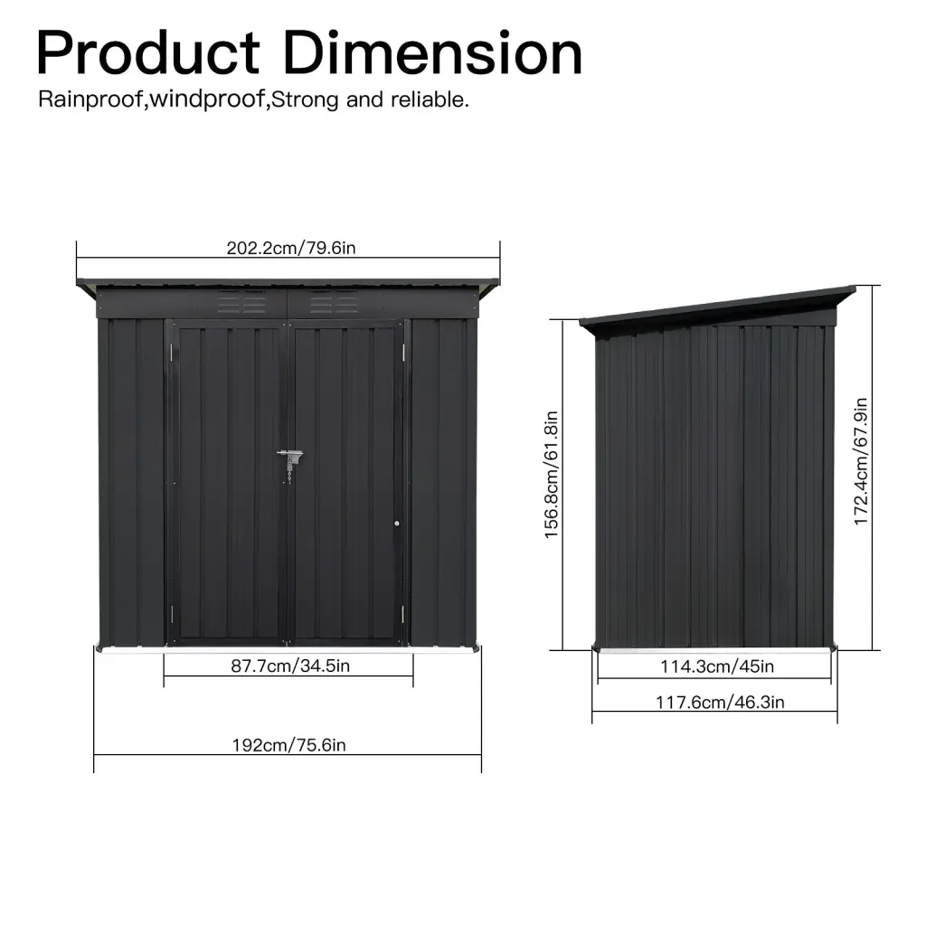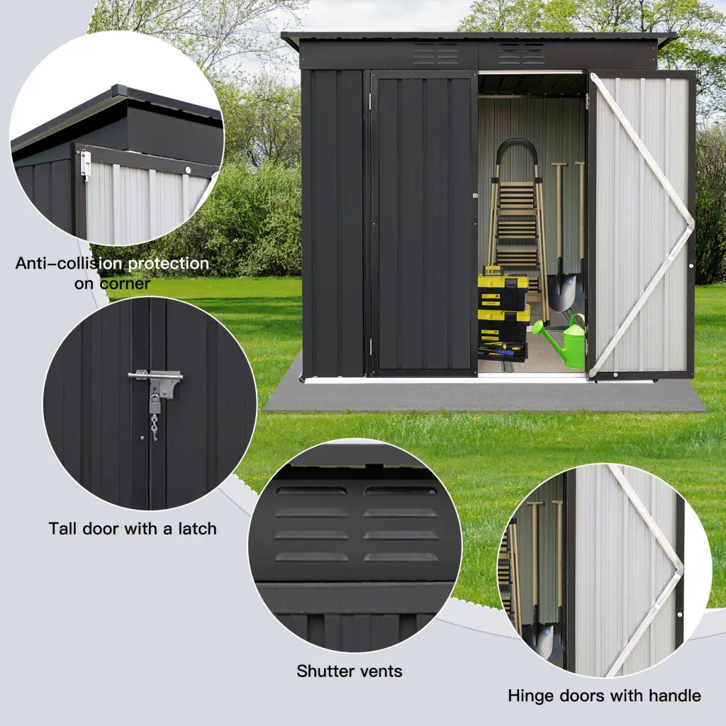 Metallic garden sheds 4ftx6ft outdoor black Specification: Attributes: [Functional Garden Storage Resolution] Featuring a pent roof, this 4ft x 6ft storage shed provides impressive storage room for garden tools, equipment, and materials. [Punched Vents] Unlike typical sheds with plastic vents, this shed comes with two inte