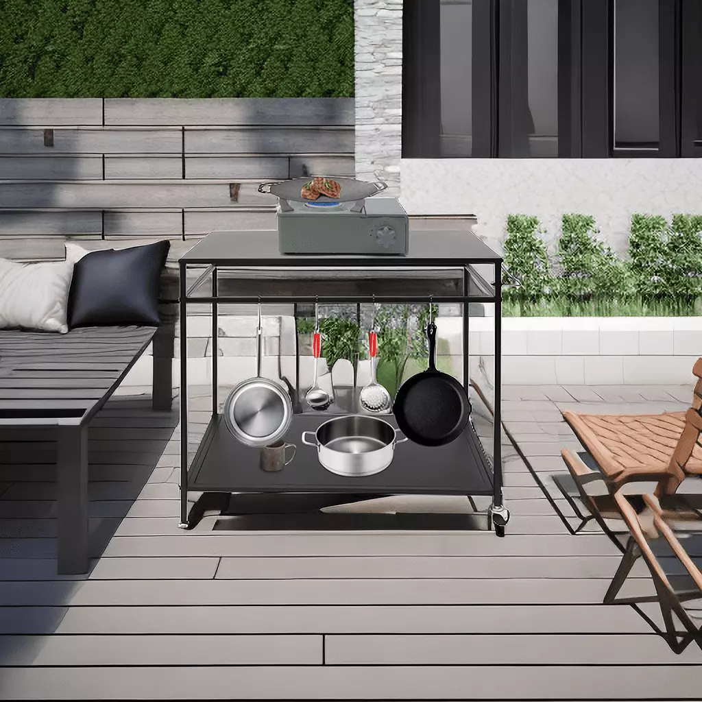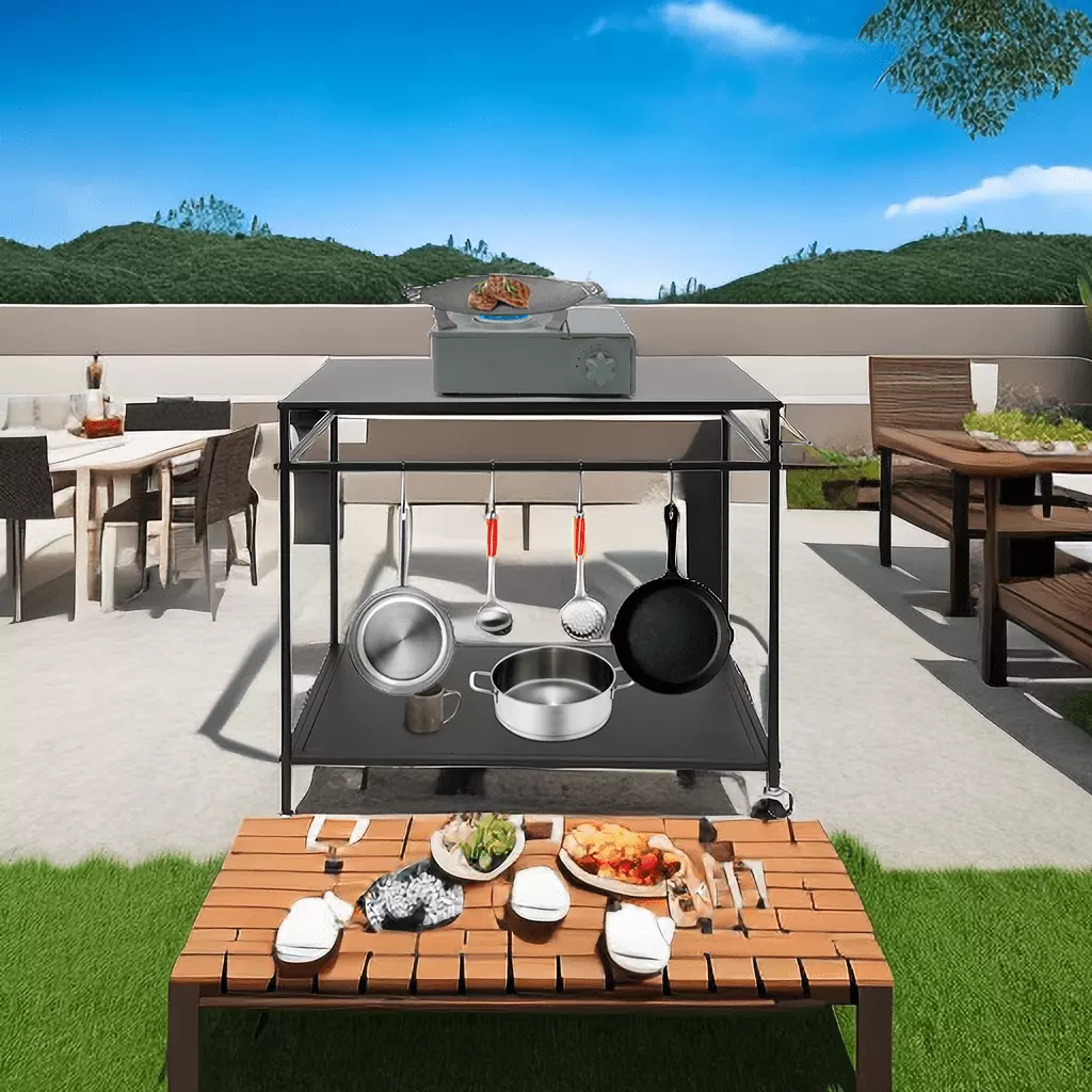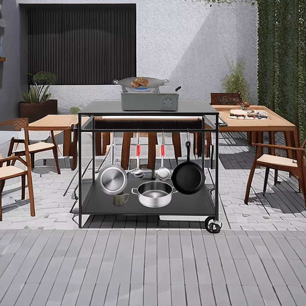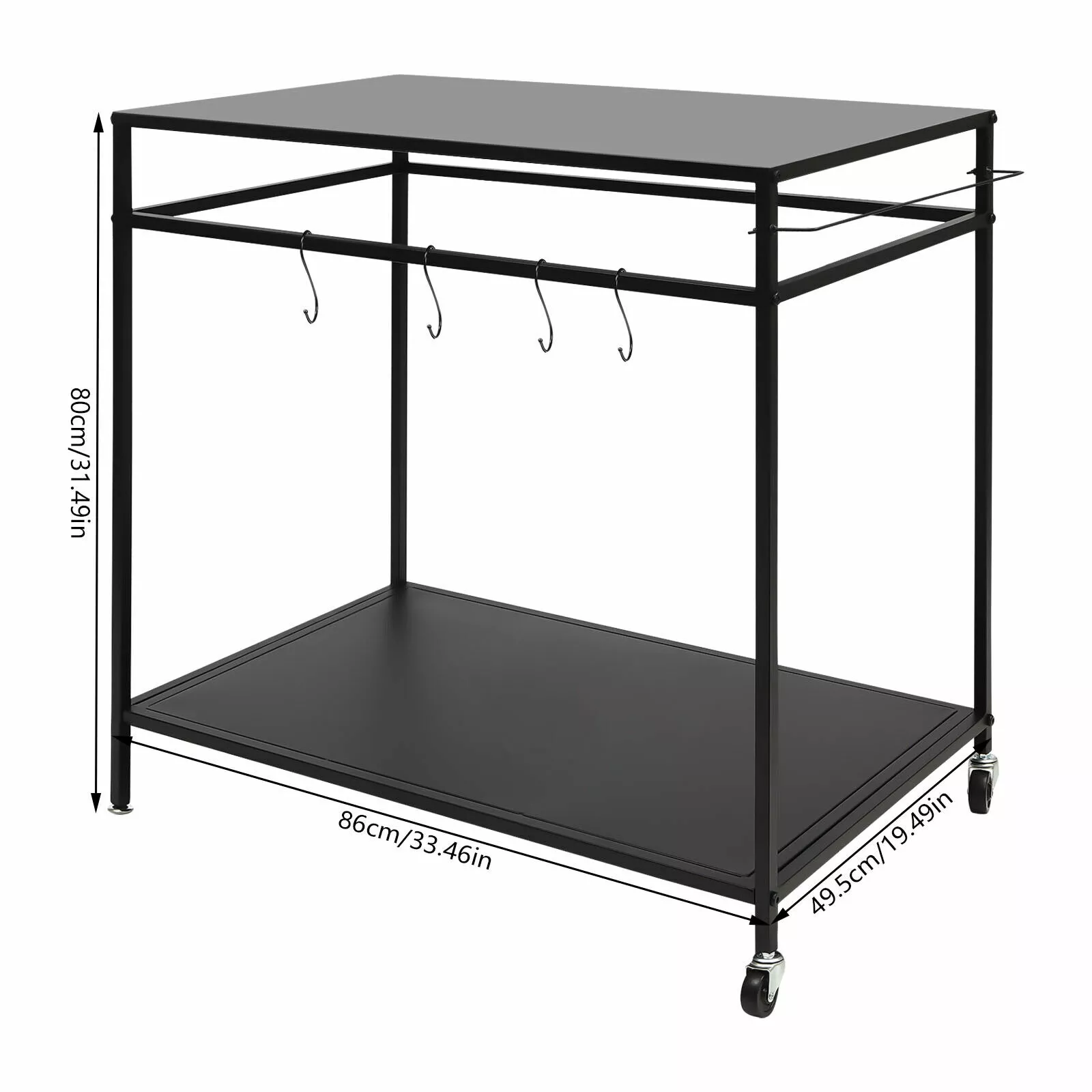 The double shelf design (each tier measures 33.46 L x 19.49 W) provides ample serving and storage space for your outdoor cooking. In addition. 4 hooks can be used to hang kitchen utensils such as griddle scraper. spatula. baking tongs. etc.. and the side shelves and crossbars can improve the neatness.