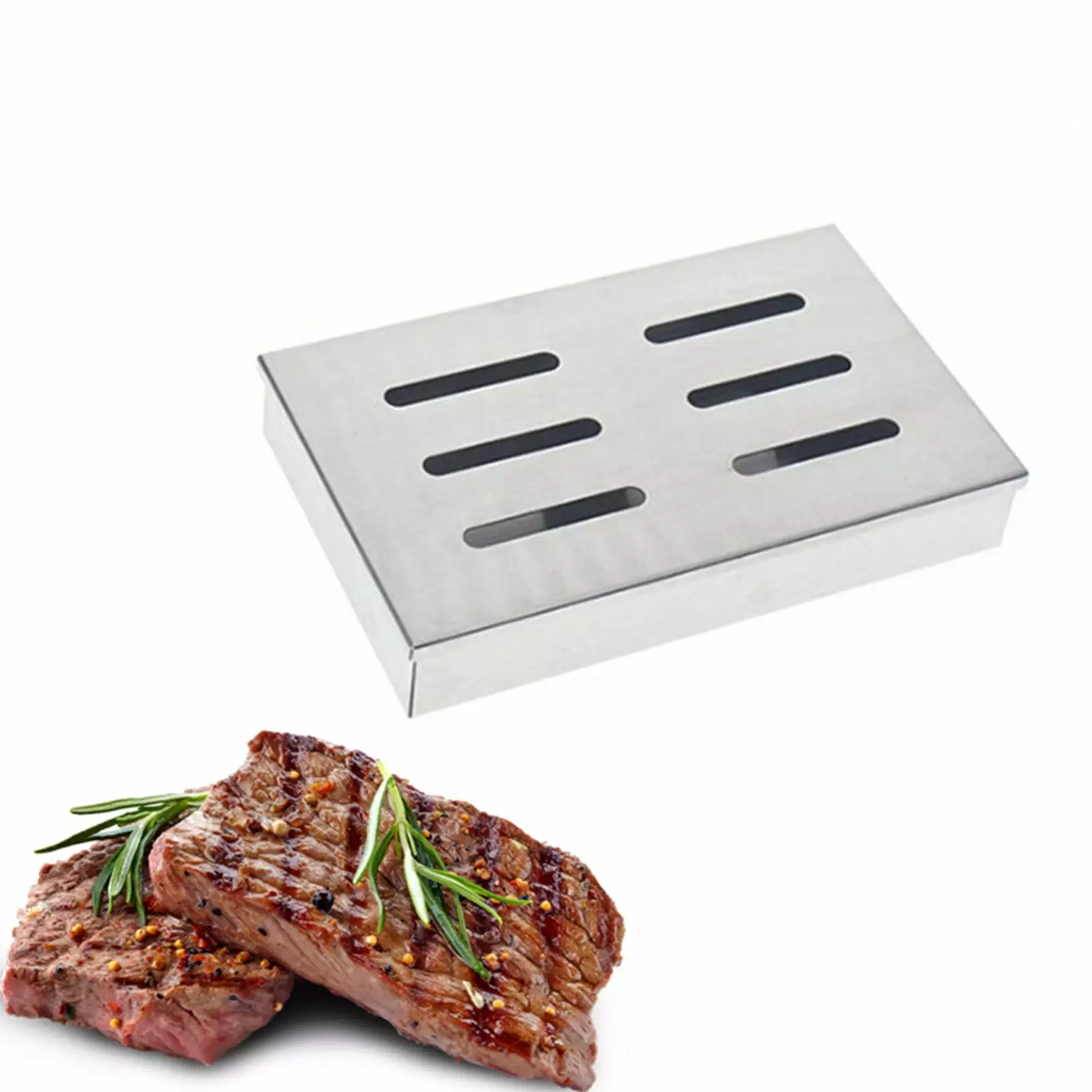 Stainless Steel BBQ Smoker Box for Grilling Wood Chips. Barbecue Meat Smoker with Removable Lid. Grilling AccessoriesFeatures: Simply add the wood chips of your choice to our heavy-duty box and place it directly on the flame. You will immediately without having to buy expensive electric smokers. Large sawdust capacity-perfectly located between the seasoning stick and the grill grate. Our large-capacity sawdust box means you will spend less time refueling the sawdust and more time hanging out with and family. Convenient hinged lid-With the hinged lid. you can easily add and replace sawdust at any time. just lift the lid to keep it open for easy access. Just the of wood chips to add a new to your of Turkey! ! Made of extra-thick stainless steel-many cheaper cases are deformed by the flame of the grill. But thanks to the thick stainless steel material. you can assured to use the Alesnomy box! ! Never warp due to high or low temperature! ! Enjoy the incredible smoky . steak and chicken are great every time you use this set box to contain something! Each piece is smoked to the point where no seasoning is needed. but a large part of the food is smoked.Product Description:Product Name: Stainless Steel BoxProduct material: 430 sanding; Thickness: 1.00mmProduct specifications: length: 21.2cm. width: 13cm. height: 3.5cm. weight: 563gProduct packaging: bag kraft paper box (21.5 * 13.5 * 4cm. weight: 50g)Product function: outdoor BBQ barbecue smoked meat ingredients barbecue tools