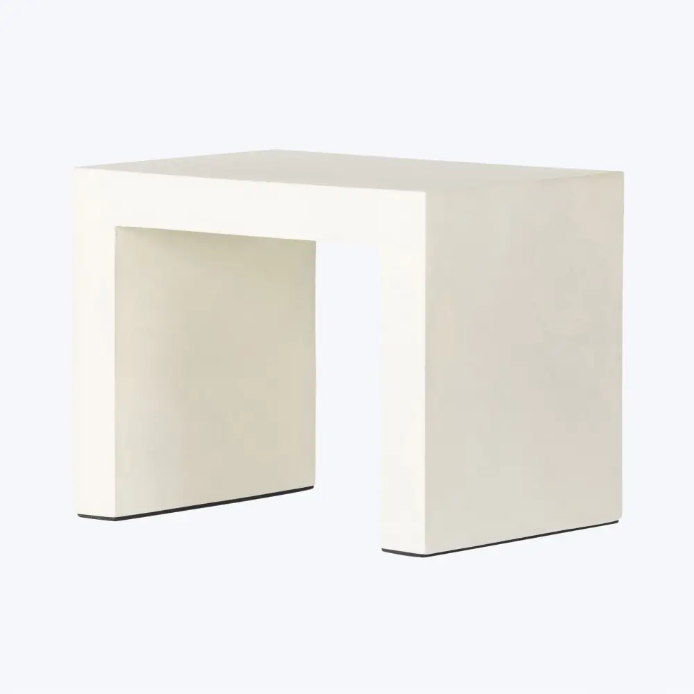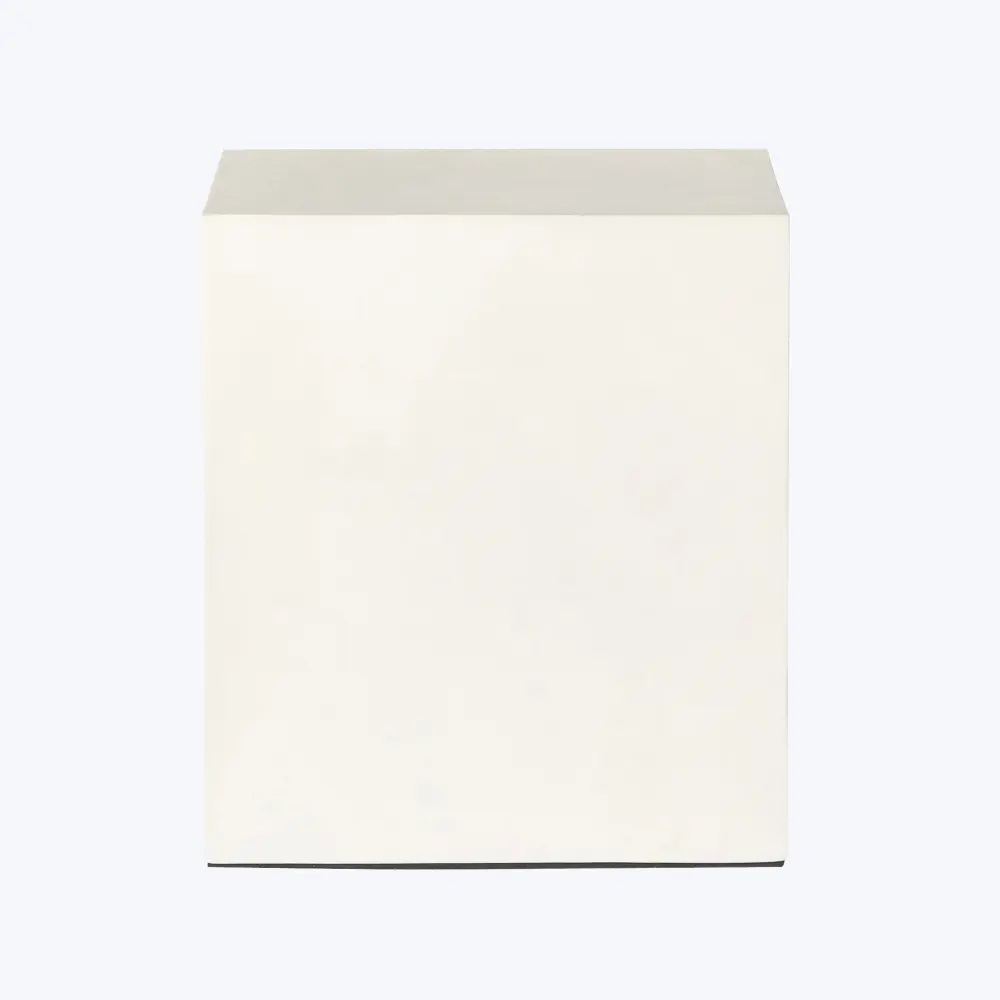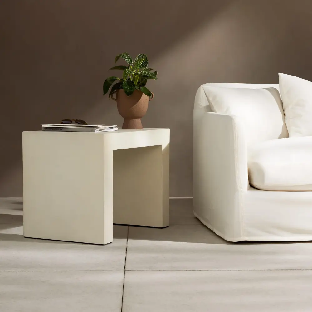Industrial materials in smoothly refined shapes. Smooth concrete forms a Parsons-style side table. This piece is designed in collaboration with Thomas Bina, whose partnership with the renowned Los Angeles furniture designer began in the early 2000s, producing several exclusive collections including reclaimed wood-driven case goods and Brazilian-inspired upholstery. Suitable for indoor or outdoor spaces. Cover or store indoors during inclement weather and when not in use.