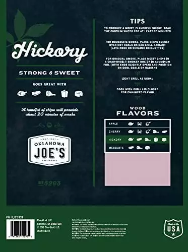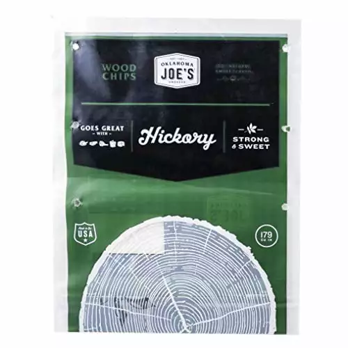 Oklahoma Joe’s hickory wood chips are the best way to get a long last burn in the cooker and to infuse great taste into meats. Wood chips can be used with smokers and electric. gas or charcoal grills. to add rich. Smokey flavor to your food. Oklahoma Joe’s hickory wood chips are ideal for smoking meats. poultry. vegetables or fish. and are made of all natural woods chips. 2-pound bag contains approximately 179 cubic inches.