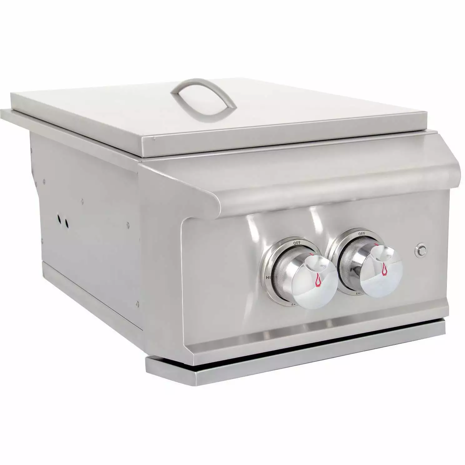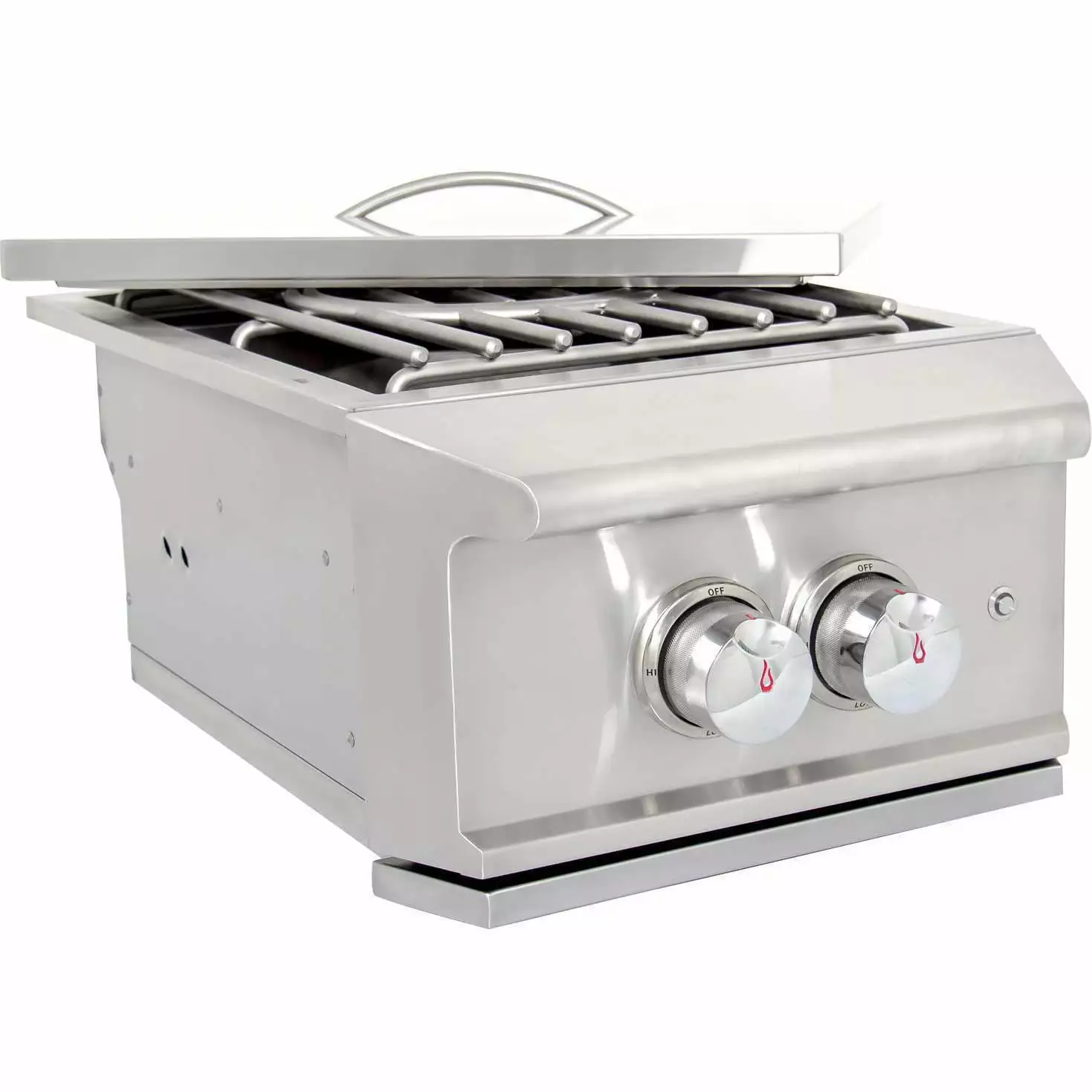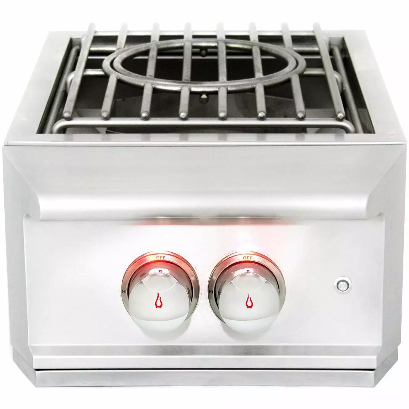 Blaze Professional LUX Built-In Propane Gas High Performance Power Burner W/ Wok Ring & Stainless Steel Lid – BLZ-PROPB-LP. BLZ-PROPB-LP. Power Burners. Introducing an affordable power burner that incorporates a narrow footprint and an efficient design which boils water in half the time as other power burners on the market. At 15 3/4 inches wide. the Blaze Professional LUX Power Burner gives you more room for additional components or more counter space for prepping and other tasks. Blaze power burners are made from stainless steel and include a removable stainless steel lid to protect the burner when not in use. The cooking grid is constructed from heavy-duty stainless steel rods with a removable 9-inch inner ring for cooking with a wok. Underneath the grid. a stainless steel guard surrounds the burner. which protects it from the wind and concentrates heat for maximum efficiency. This propane gas power burner features two. individually controllable burner rings. The inner ring is rated for 25.000 BTUs. and the outer ring is rated for 35.000 BTUs. The burners are lit with a simple push and turn ignition. This dual ring design is ideal for cooking versatility. The inner burner is great for simmering sauces. or use both burners when boiling shrimp or frying fish. Cooking with the outer ring is perfect for large skillets and pans. as the high heat allows the pan to heat up quickly. The burner ring is made from commercial quality. 304 cast stainless steel for longevity. This power burner also sports red LED control knob illumination for cooking and entertaining at night. If you are looking for an affordable power burner so you have more in your budget for other components. Blaze power burners are a great solution. A power transformer is included for the lights….