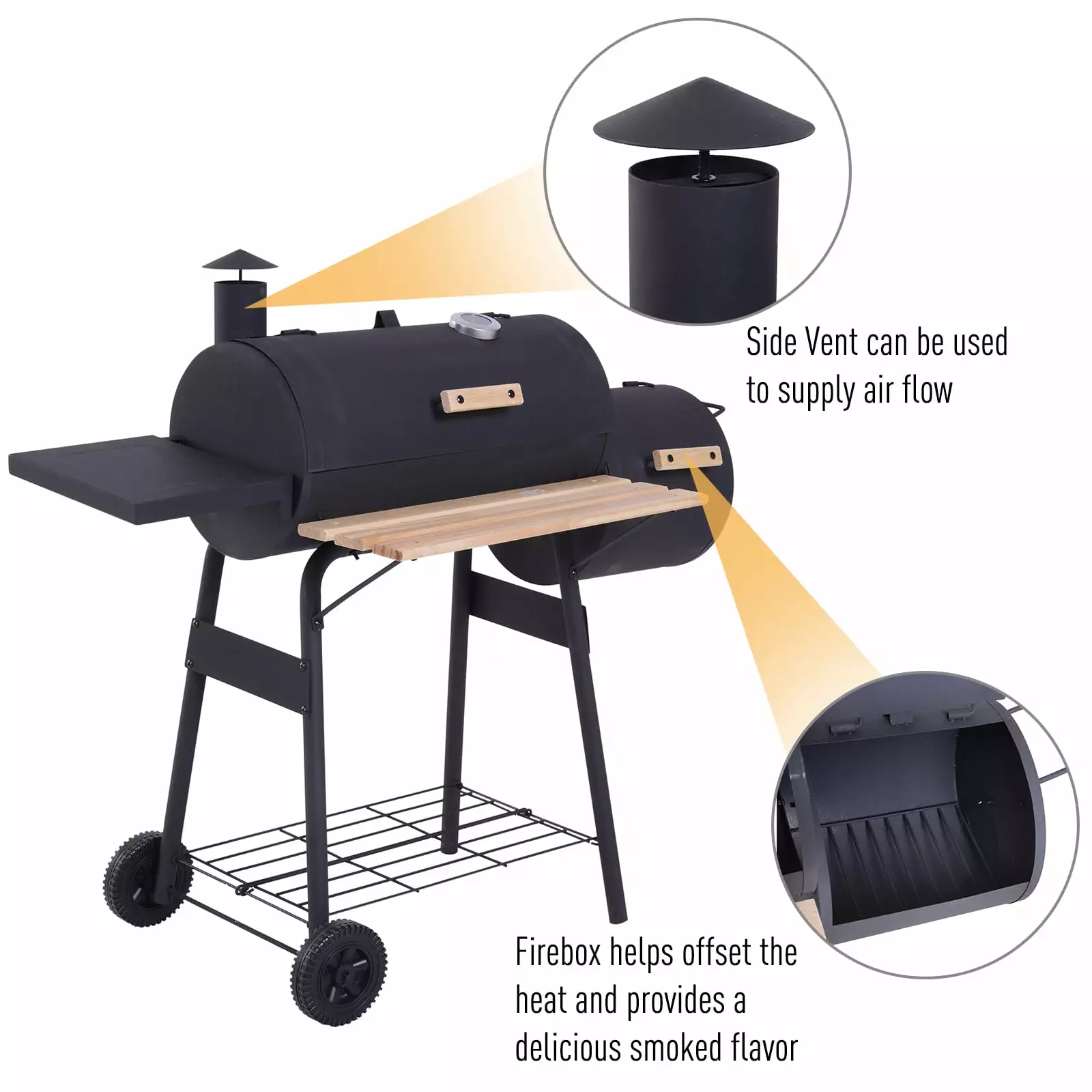 • UNIQUE DESIGN: As a combination of offset smoker grill. BBQ. and portable charcoal grill. the multifunctional bbq grill is your one-stop shop for perfect backyard gatherings. Firebox helps offset the heat and provides a delicious smoked flavor. while the side vent can be used to supply air flow.