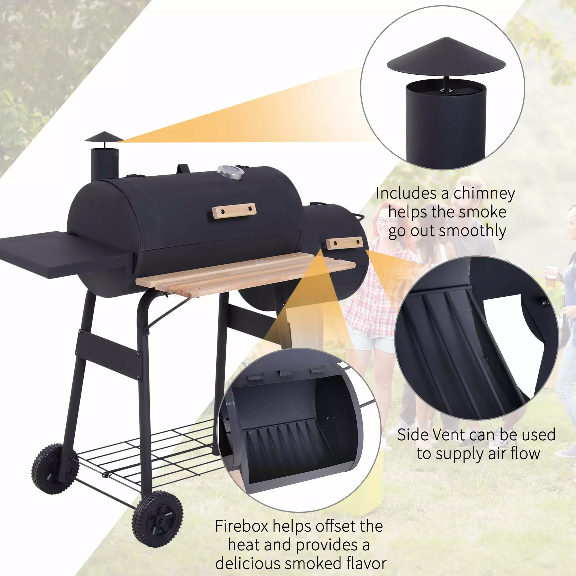 - UNIQUE DESIGN: As a combination of offset smoker grill. BBQ. and portable charcoal grill. the multifunctional bbq grill is your one-stop shop for perfect backyard gatherings. Firebox helps offset the heat and provides a delicious smoked flavor. while the side vent can be used to supply air flow.