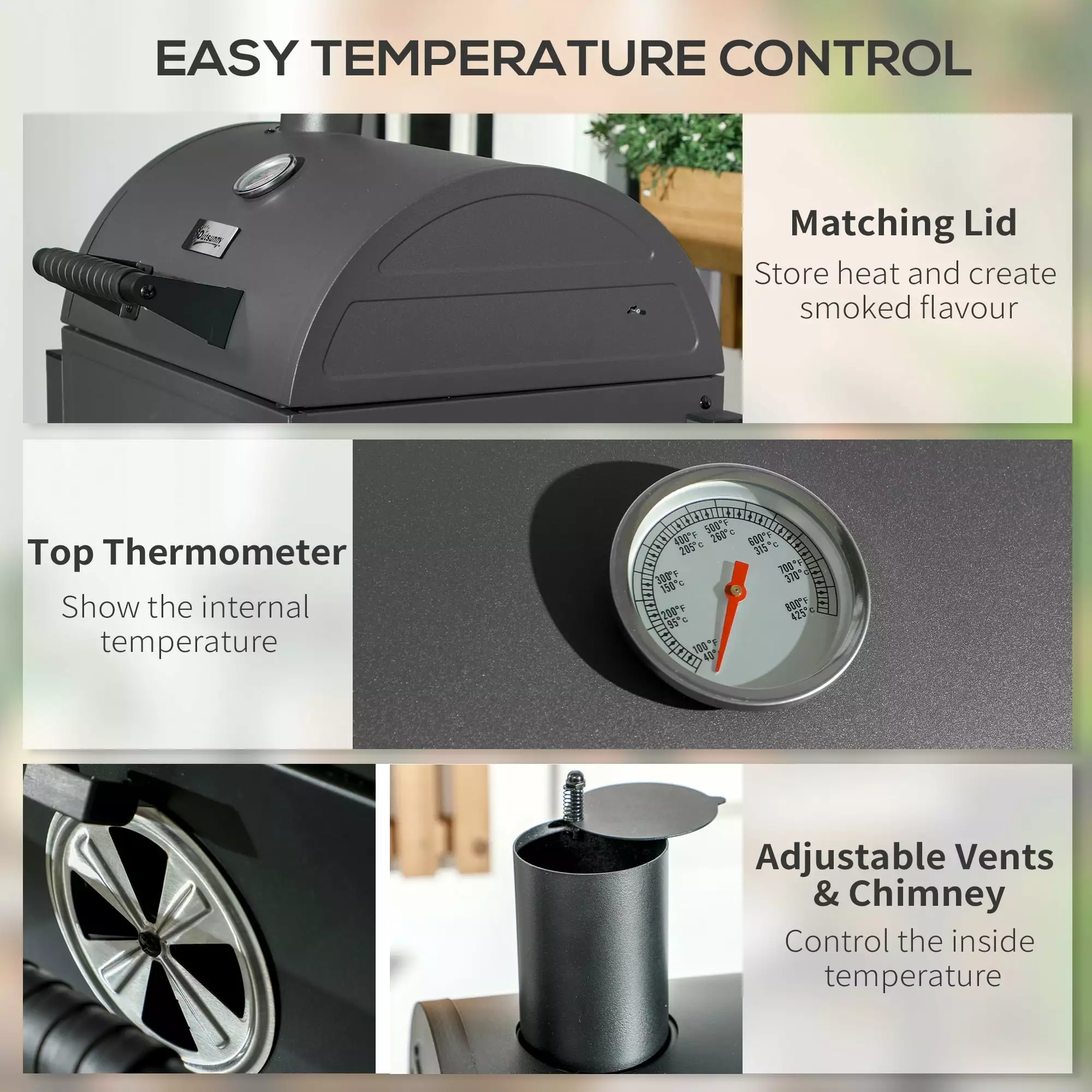 - Convenient Controls: Featuring a lid. adjustable vent. and chimney controls. our small bbq grill keeps you in control. A thermometer on the front keeps you informed as you hold in heat to get your food just right.
