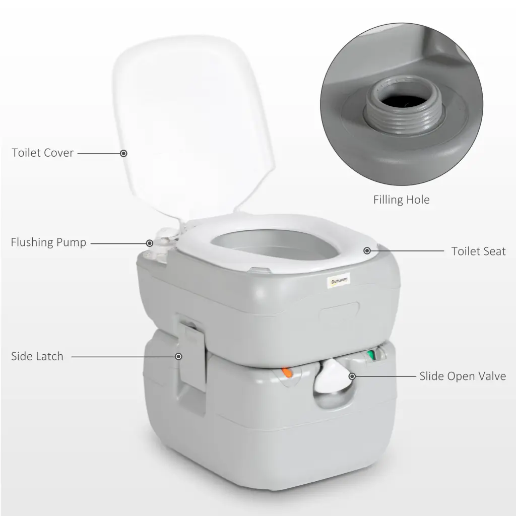 Outsunny Travel friendly Toilet for Adults 5.8 Gallon, Porta Potty with Level Indicator, T-Type Water Outlets and Anti-Leak Handle Pump for Camping, Boating, Hiking, Travel, RV Characteristics: Two Tanks with Water Level Indicator: This camping toilet comes with a 3.25-gallon fresh water tank and a 5.75-gallon waste wat