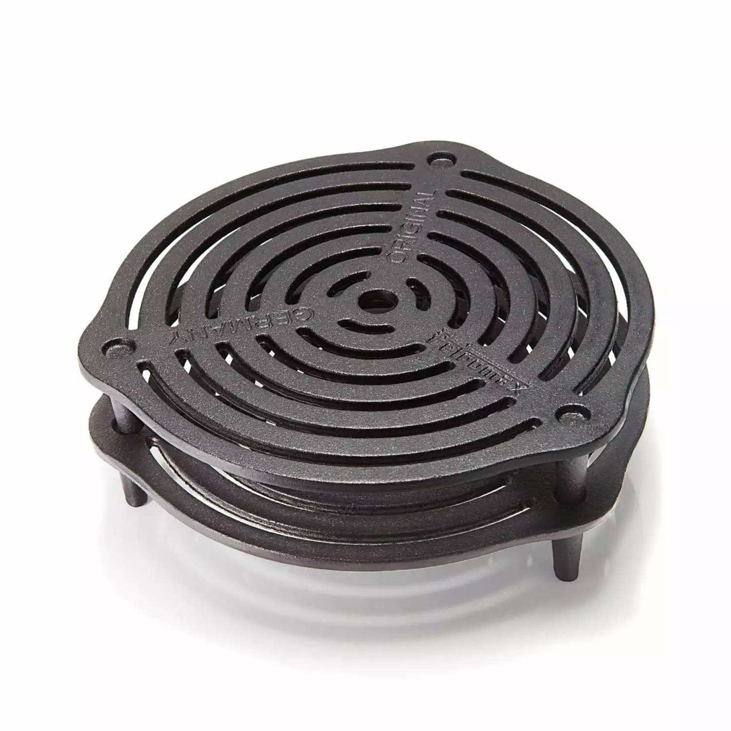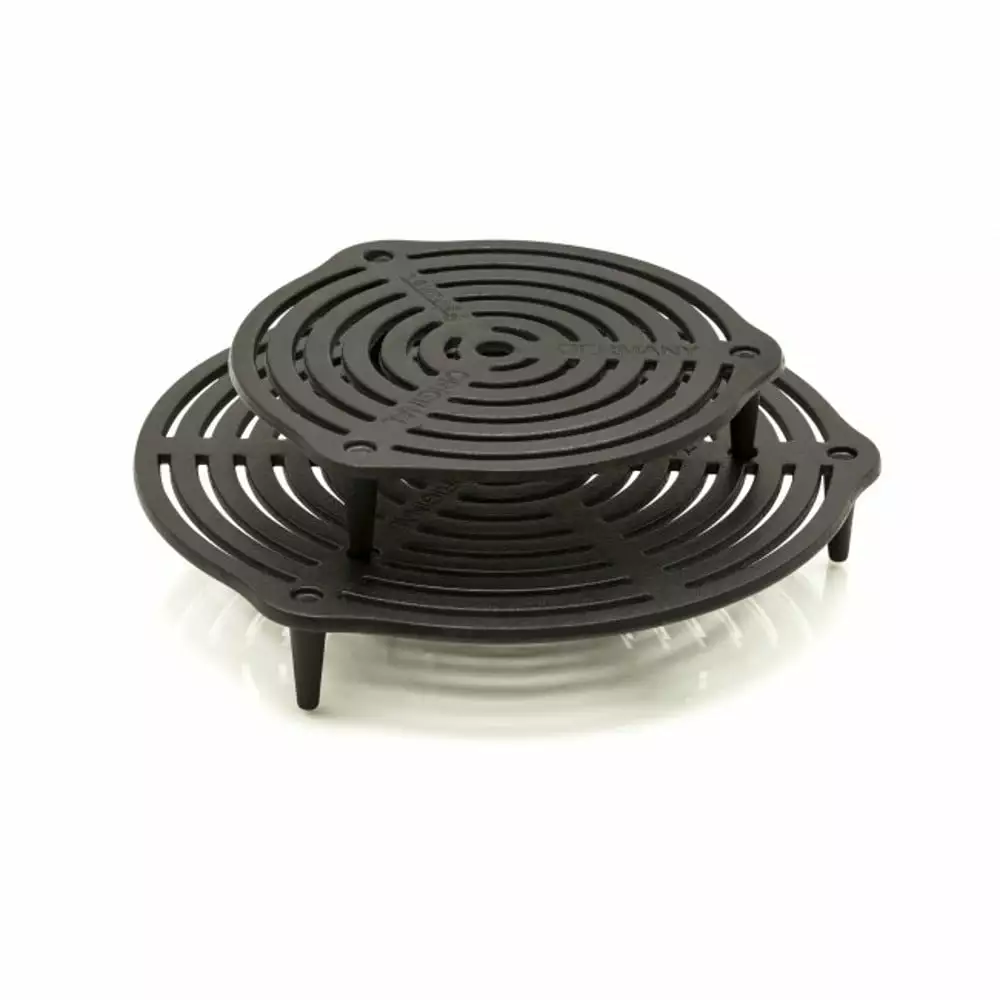 Petromax Cast Iron Stack Grate for Dutch Ovens. Prevent Bottom Burning and Evenly Distribute Heat. Can Also Place Directly in the Campfire or on the Table as a Trivet. 11". The Petromax Stack Grate made of solid cast iron manages a first-class heat distribution – exactly what you need for baking. braising and steaming at several levels in the Dutch Oven. Your meat. vegetables and cakes are a success and do not burn. for the device stands on three 1.7-inch-long feet that manage the ideal distance from the bottom of the pot. Moreover. the Stack Grate fits particularly well in the Petromax Dutch Oven 3.7 Qt and in all bigger pots. You can use this grate immediately thanks to its seasoned finish. In the pot. in the fire or as a trivet For steaming in the Dutch Oven. put in one grate or simply pile up several grates. If the grate is directly in the embers. it quickly fries the perfect grill marks onto your piece of meat. Or you place the Stack Grate in the fire and use it as a surface for putting down percolators. tea kettles or Dutch Ovens without feet. You can also use it as a practical trivet for hot cookware on the table.Material: Cast Iron. Dimensions: 11"OD. 1.9"H. Weight: 4.4 lb.