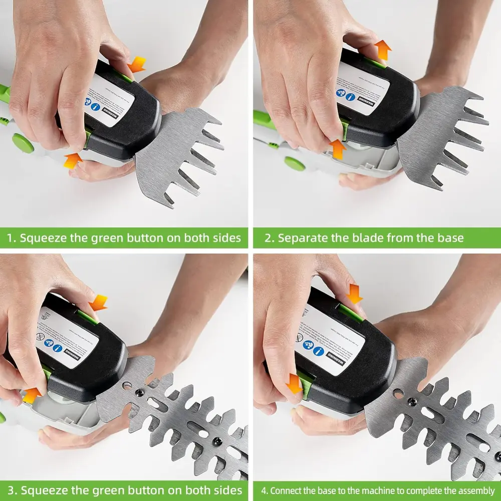Small shears with big role: 2-in-1 multifunctional cordless grass trimmer with 6.7-inch hedge cutter and 3.47-inch grass trimmer, easy switch between hedge trimming/mowing, advanced blade change system allows you to easily modify blades in 3 seconds. Ideal for gardening work.