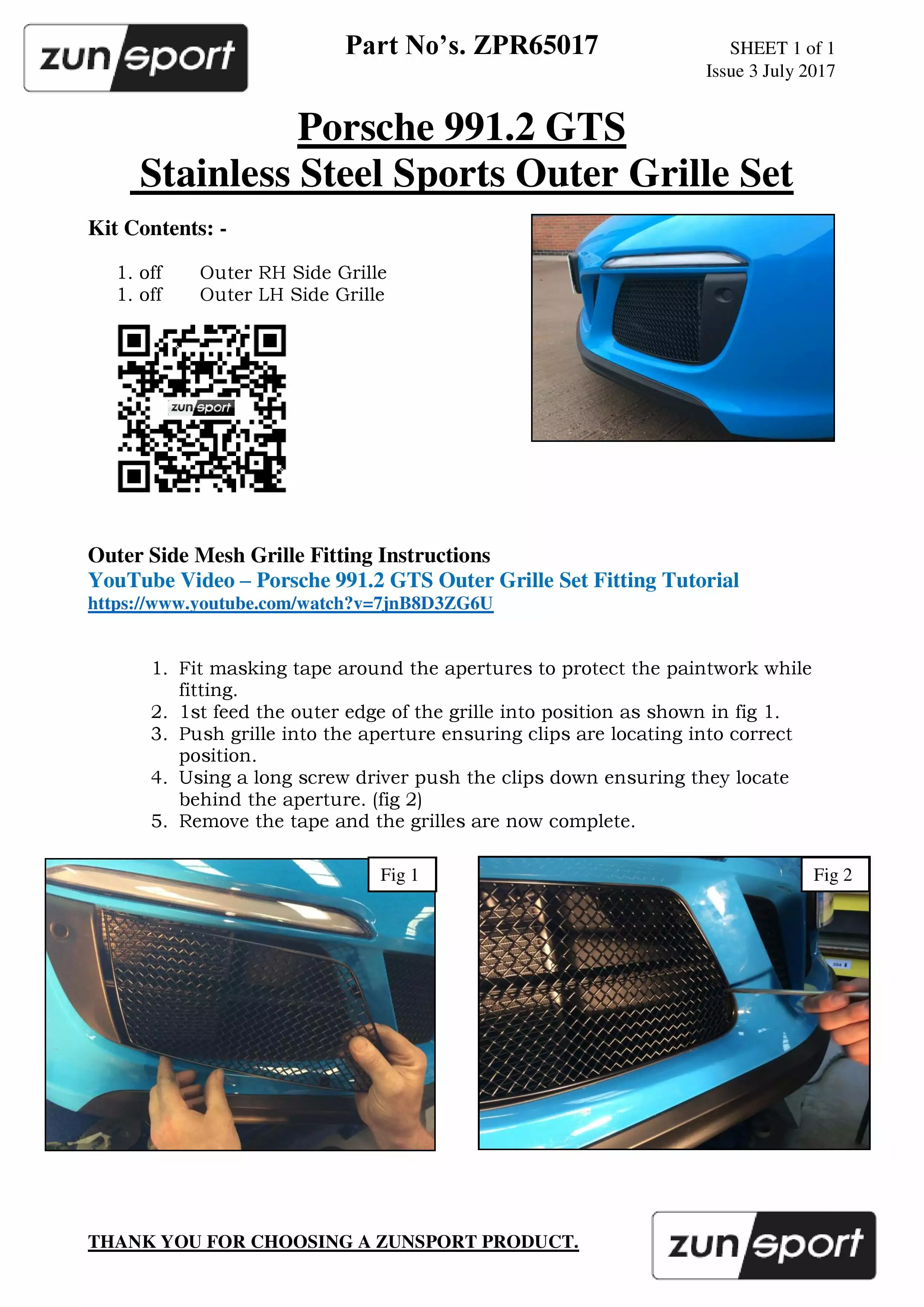 Zunsport compatible with Porsche Carrera 991.2 GTS – Outer Grill Set (2017 to 2018) Road debris and leaves can cause major damage to your vehicle’s heat exchangers. fans and brakes if left unprotected. but if you own a Porsche Carrera 991.2 GTS – Outer Grill Set our can guarantee a number of advantages on the road. Protect your vehicles essential components from damage. discover easy installation and enjoy a seamless finish that suits your car’s original design by purchasing a grill set from us. We use premium stainless steel woven wire mesh and a handcrafted approach with every grill that leaves the Zunsport workshop. and each is guaranteed for the life of your car to give you a confidence not found with other grill manufacturers. It must be noted that this grill is comprised of the stainless steel grill and the means of fixing it to your vehicle.It does not include any replacement body parts.Porsche Carrera 991.2 GTS – Outer Grill Set – Black Finish (2017 to 2019)