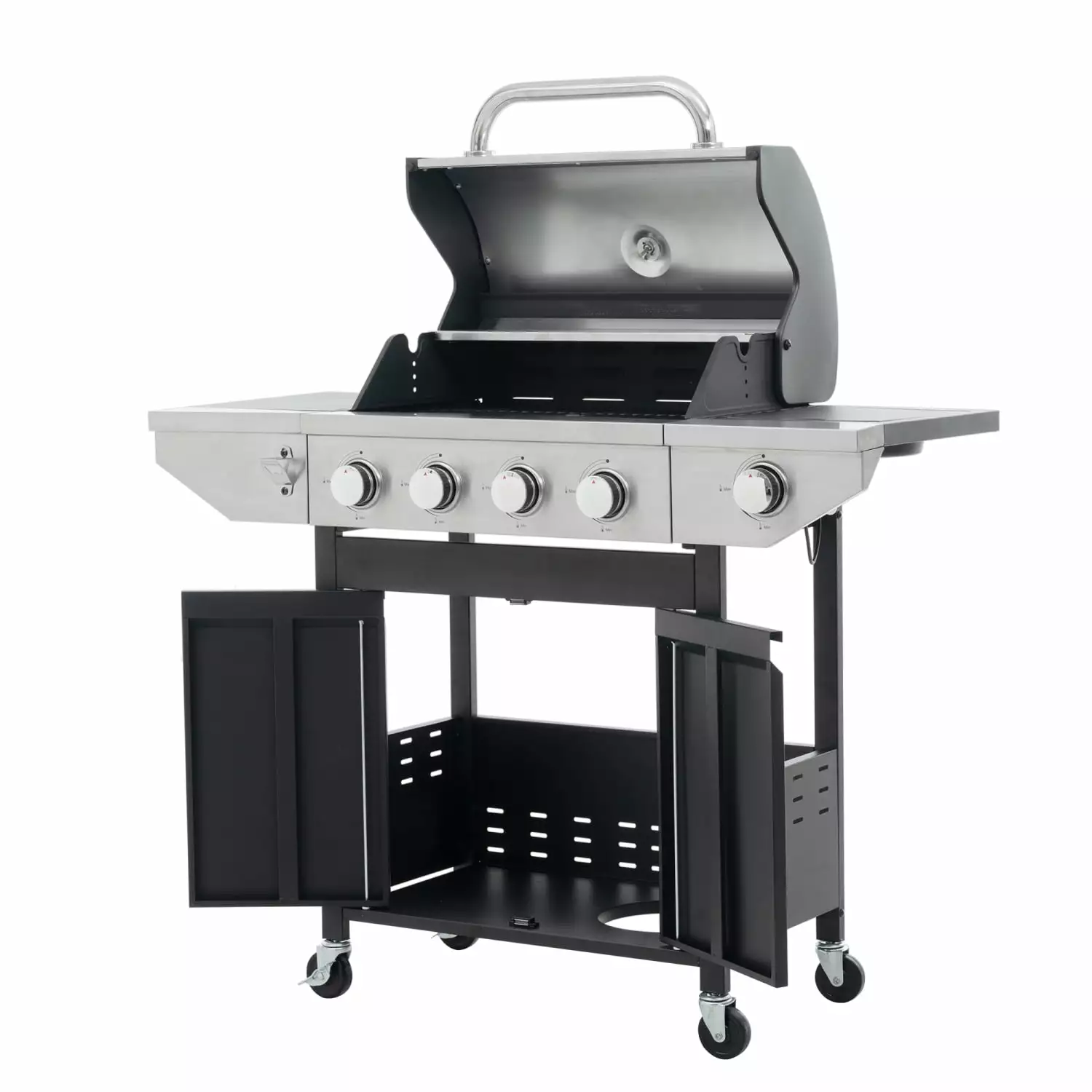 - Each head can be independently fired. reliable side plate strength. stainless steel high temperature cover. side black powder. galvanized lining. cover with thermometer (round). stainless steel control panel. black body spray high temperature resistance 600. Fast & Even Heat: reliable enough to fire up burners immediately. with four wheels (two directional wheels. two steering wheels)