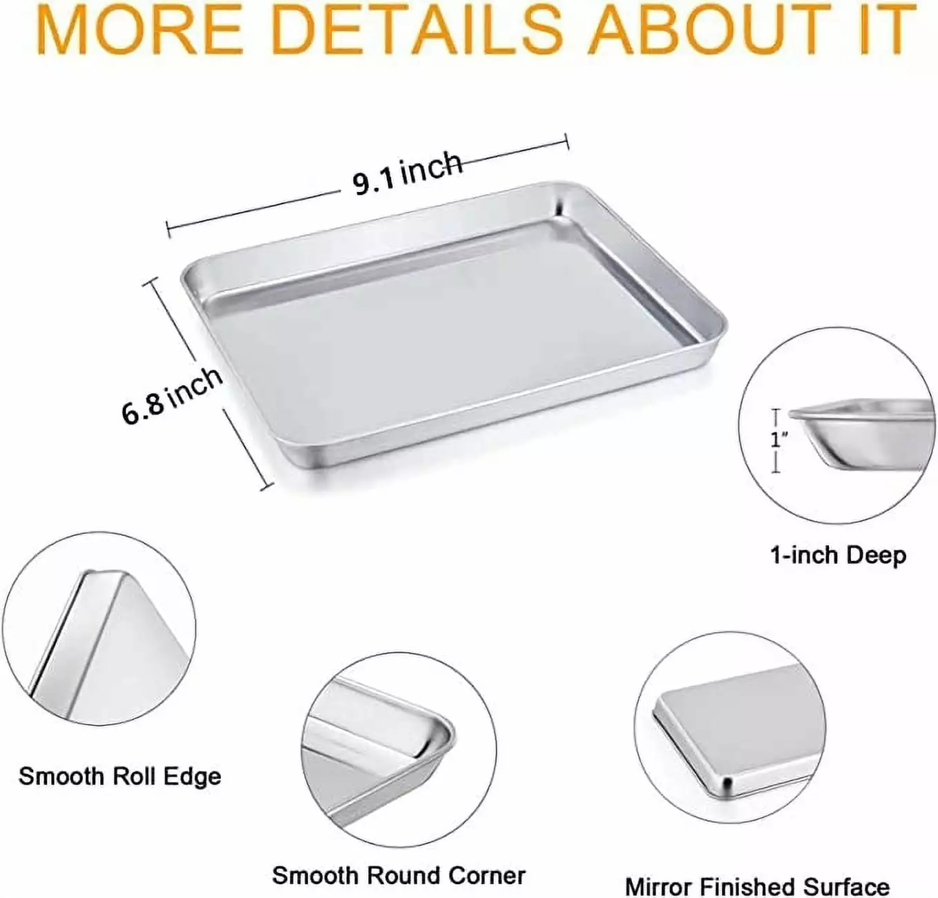 - [9.1 INCH BAKING PAN]Baking pan with size 9.1 x 6..8 inch. Perfectly fit most regular oven. 1 Inch deep full sides help to cook more food and can contain more sauces. Smooth rolled edges are comfortable to hold and can protect your hands roundly. Large size sheet pan is convenient to bake plenty of food for family gathering or friends party. Also can be used as serving tray or cookie tray