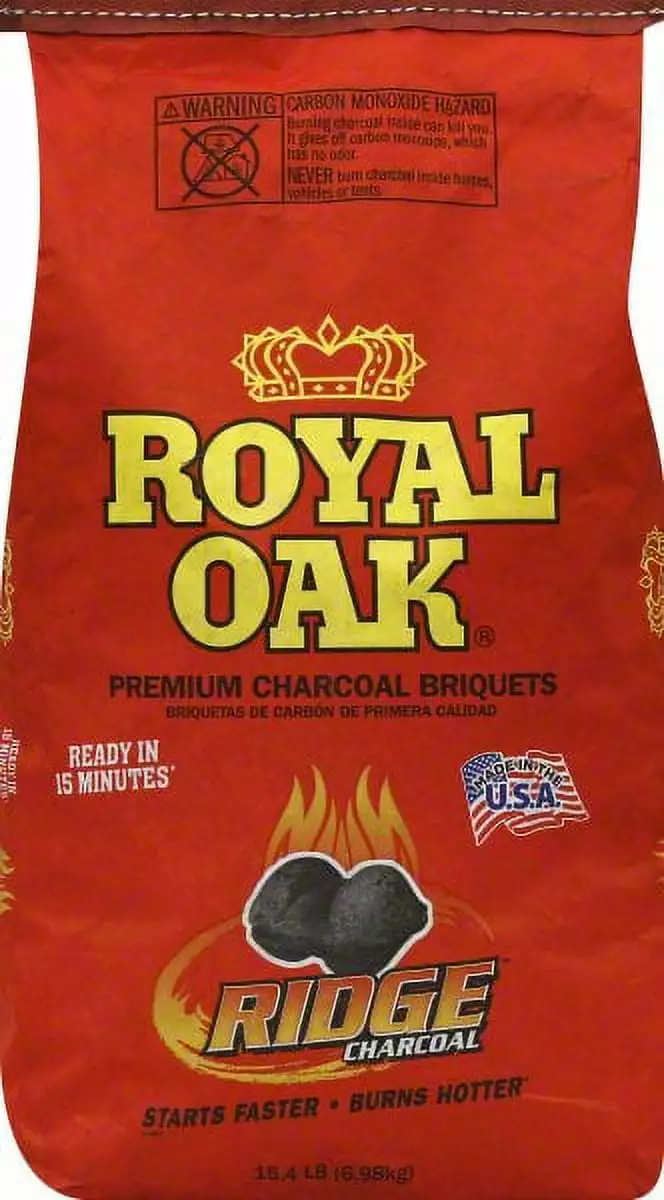 Charcoal Briquets. Premium. Bag 15.4 LB Ready in 15 minutes (Based upon following back label directions). Starts faster. Burns hotter (Compared to previo product (2010)). Guaranteed Satisfaction. For over 60 years Royal Oak has been proud to provide you with premium quality charcoal briquets. We at Royal Oak stand behind our product and offer our guarantee of satisfaction. We want your barbecue to be successful and if you have any comments or questions please write to at 1 Royal Oak Avenue Roswell. GA 30076. .