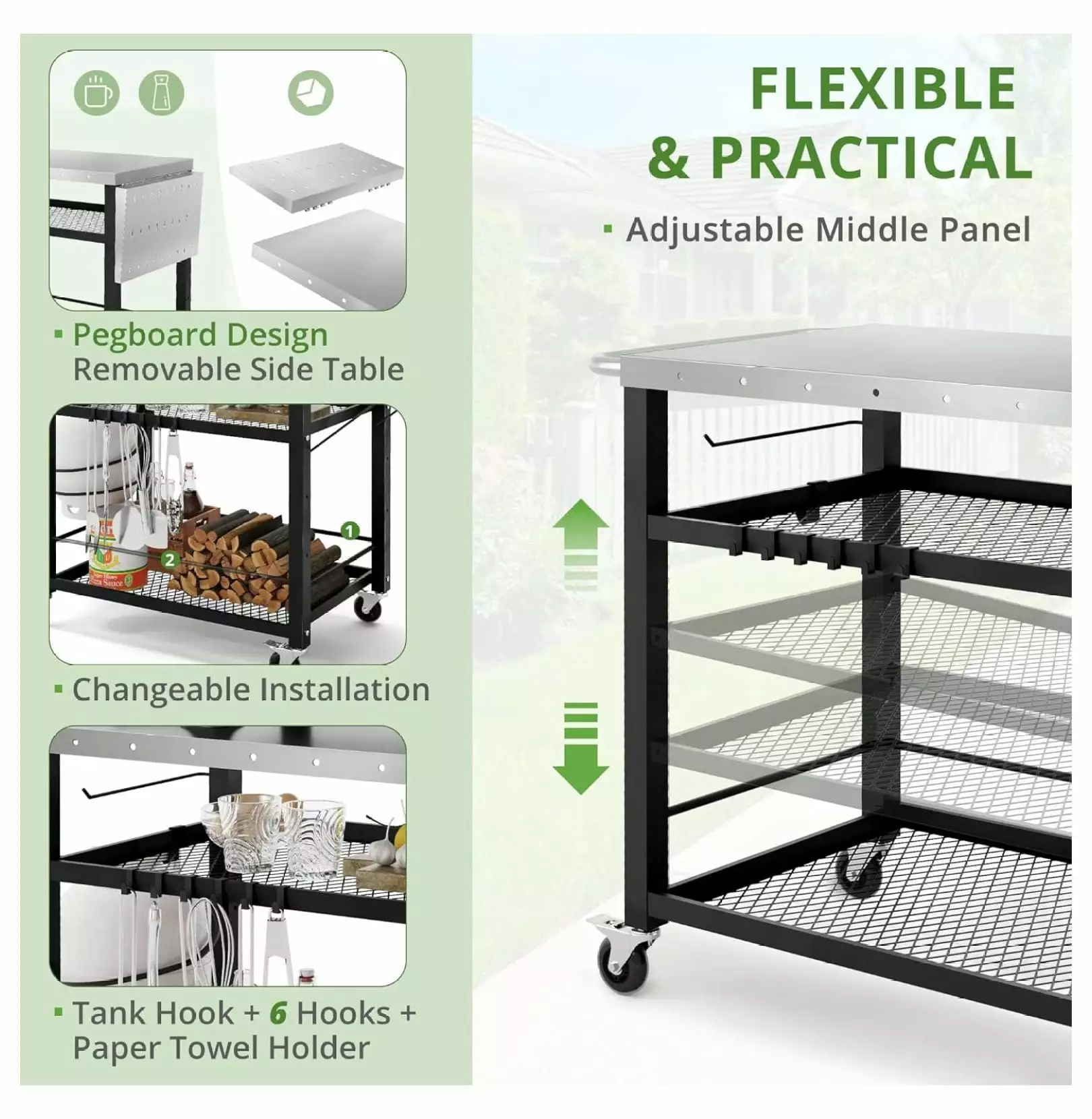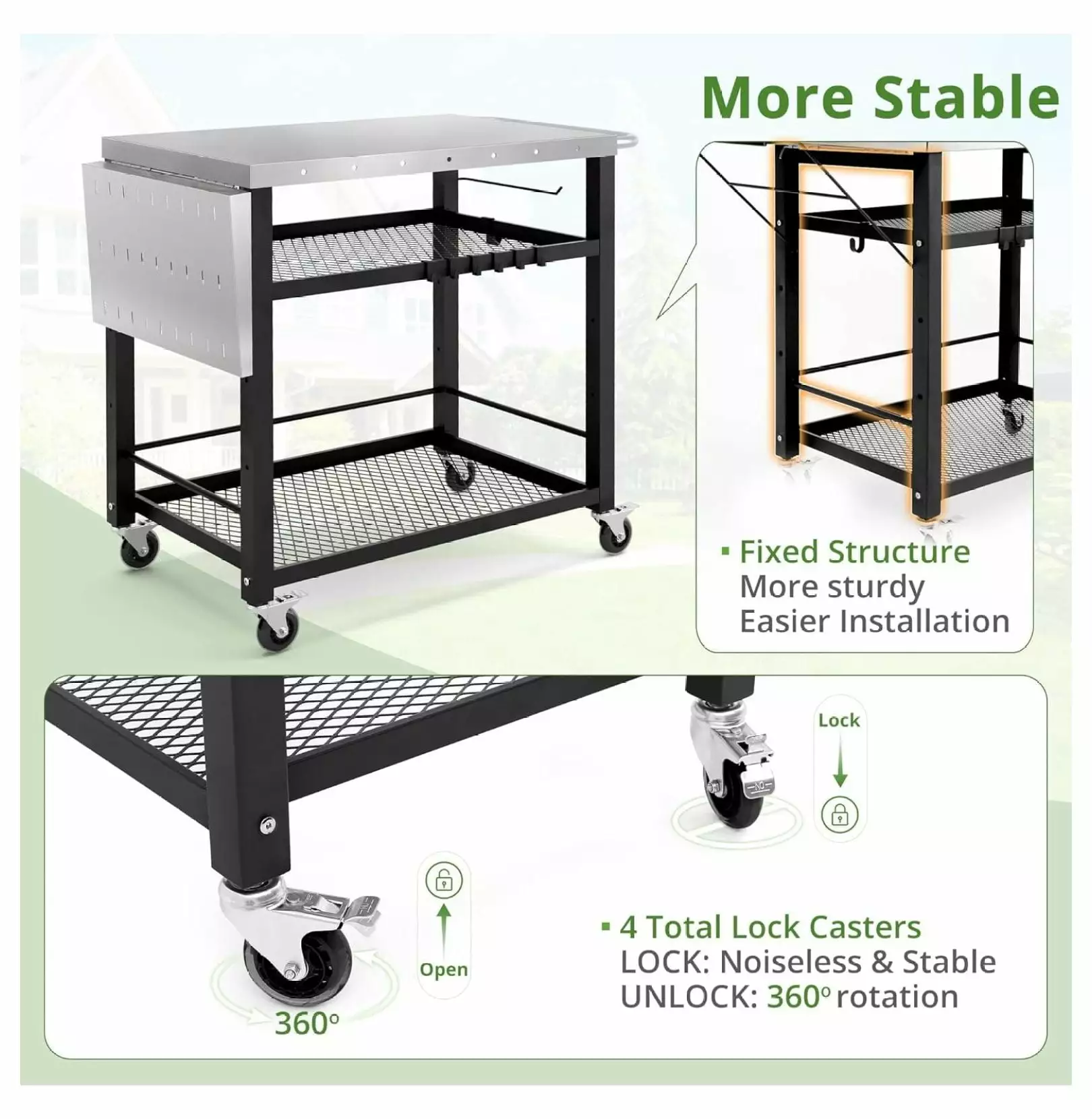 eeyysaney 43.3" W x 19.7" D Outdoor Grill Cart Table with Foldable Side Table. Movable Pizza Oven Stand for Outside Patio. Three-Shelf Stainless Steel Flattop Outdoor Cooking Prep Table with Wheels