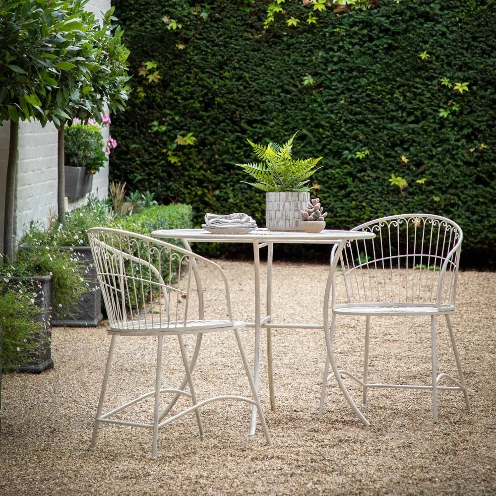 Offering a more unusual take on traditional bistro café style, this set features a flowing design which is echoed in the round seats and lovely curved backs of the chairs. Constructed from metal, it has a lovely distress soft white finish. It is also available in a metal patina finish. Sold separately, we also offer round seat pads, designed to work superbly with these chairs, to add comfort so you can relax for longer.