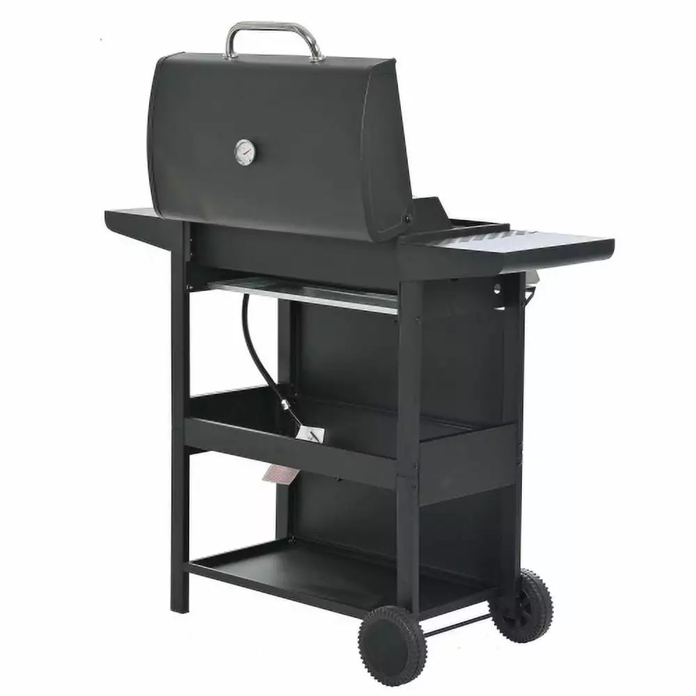 - The whole Stainless steel control panel with chromium plating control knob makes this propane gas grill more study and delicate. a stainless steel handle and a built-in stainless steel thermometer on the cover lid. two tables and two wheel casters for storage and moving.