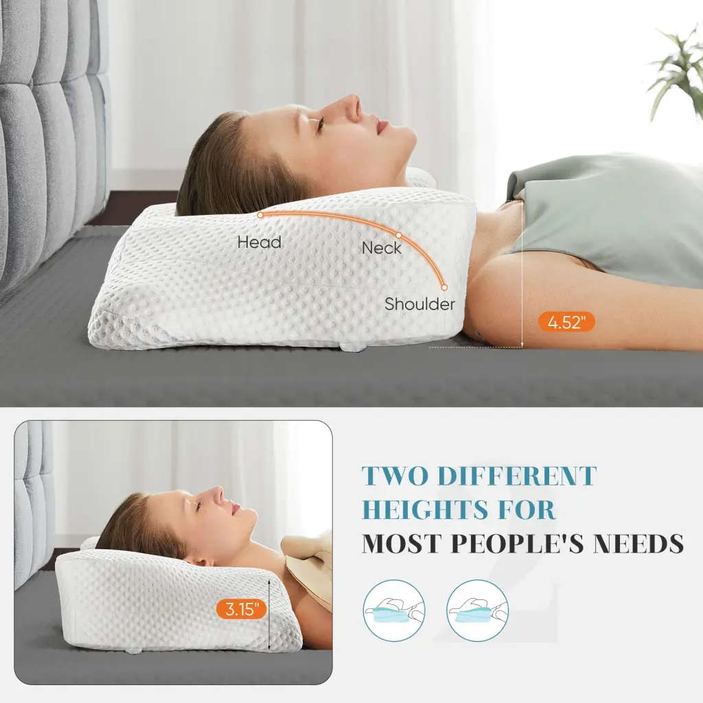 This cervical pillow offers two different heights for you to choose from. Our king size pillow is designed for different sleeping positions and can be a supine, prone or side sleeper pillow. It has a wider range of contact with your head and shoulders, so no matter how much you roll over in your sleep, you won’t feel stiffness in your neck.