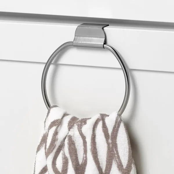 Keep hand and dish towels conveniently within reach with the innovative Over the Cabinet Towel Ring from Spectrum®. The innovative design requires no tools or installation and easily slips on and off in an instant. Made of sturdy steel, a foam backing protects cabinets from scratches. Ideal for the kitchen and bathroom