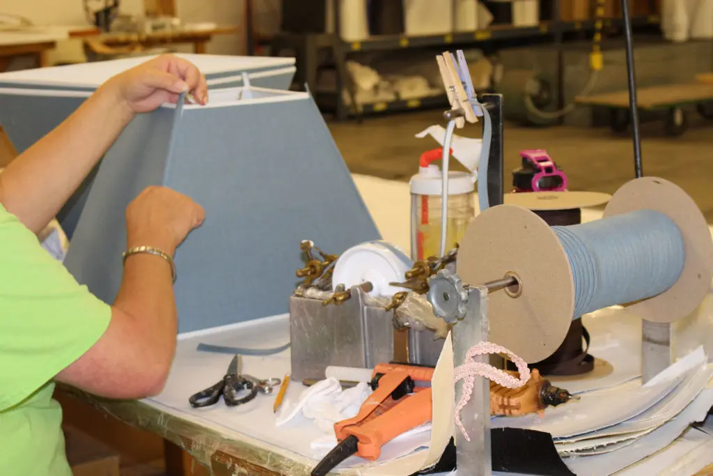 Our lampshade comes with a washer that is made of sturdy metal with a brass finish. The washer fitter with an outside diameter of 1 inch and an inside diameter of 7/16 inch sits on top of the harp and is secured by the existing finial of the customer.
