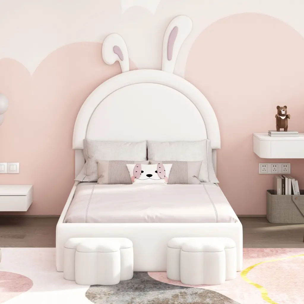 Twin size Upholstered Rabbit-Shape Bed with 2 Storage Stools, Velvet Platform Bed with Shopping basketoon Ears Shaped Headboard, White Specification: Twin size Upholstered Rabbit-Shape Bed with 2 Storage Stools,White This bed is designed in the shape of a rabbit, which is very cute and warm. It will be very attractive to deco
