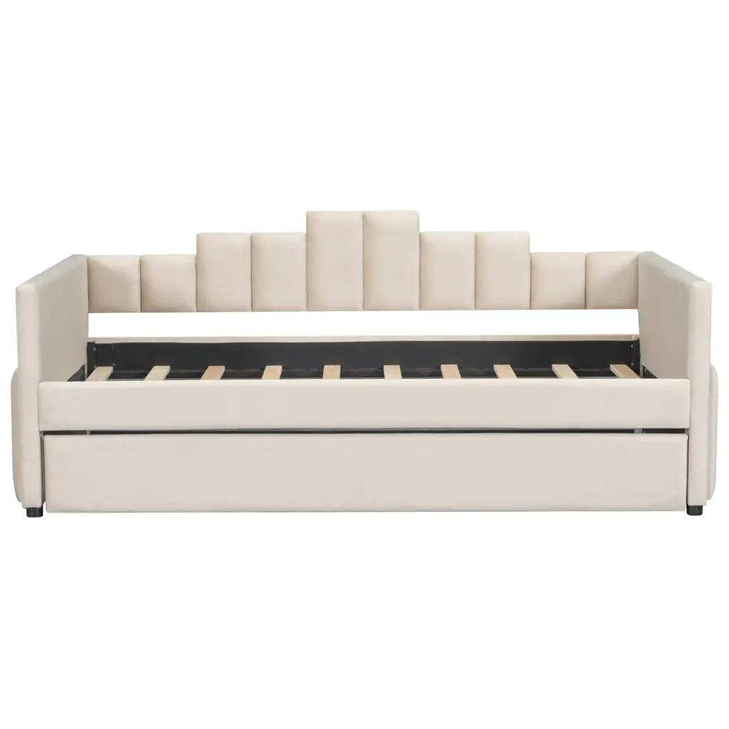 Twin Dimensions Upholstered Daybed with Light and Usb Port, Beige Description: Twin Dimensions Upholstered Daybed with Light and Usb Port Embossed with atypical stripes, this daybed brings artistic atmosphere to your home. The design is full of fun and can create you feel simple and comfortable.This bed provides a fun and adorab