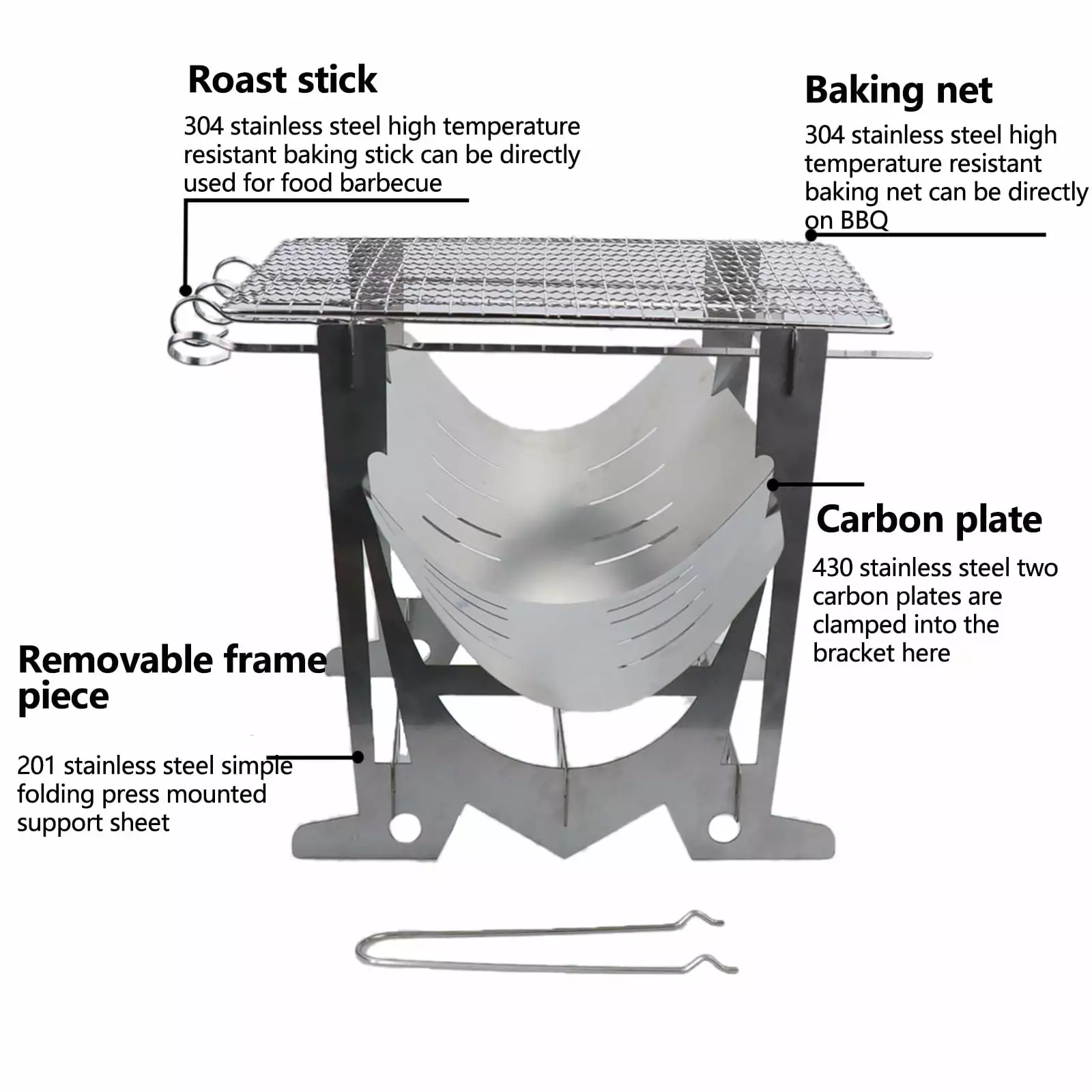 [Portable and Portable]With storage bag. you can easily store it or take it with you. Comes with 4 baking sticks. 1 grilling net. 1 fire pipe. and 1 wire saw.