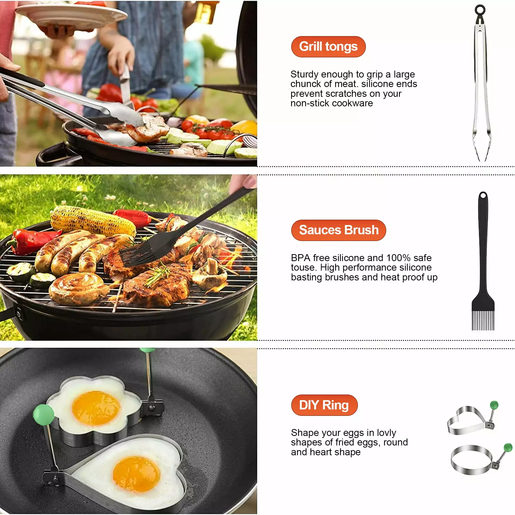 - [A Perfect Gift Choice] This griddle accessories kit for blackstone includes: 2 X Egg Ring 1 X Long Spatula 1 X Slotted Spatula 1 X Griddle Scraper 1 X Slotted turner 1 X Grill Tongs 1 X Griddle Chopper 1 X Grill Cleaning Brush 1 X Grill Brush 2 X Sauce bottles 1 X Graduated chopping scraper 1 X Oxford Cloth Storage Case This griddle accessories for blackstone can be a perfect gift for all BBQ or cooking lovers. Absolutely the Ideal gift choice for Father’s Day. Thanksgiving or Christmas. Enjoy the BBQ time with your family or friends at home. rooftop or campsites.