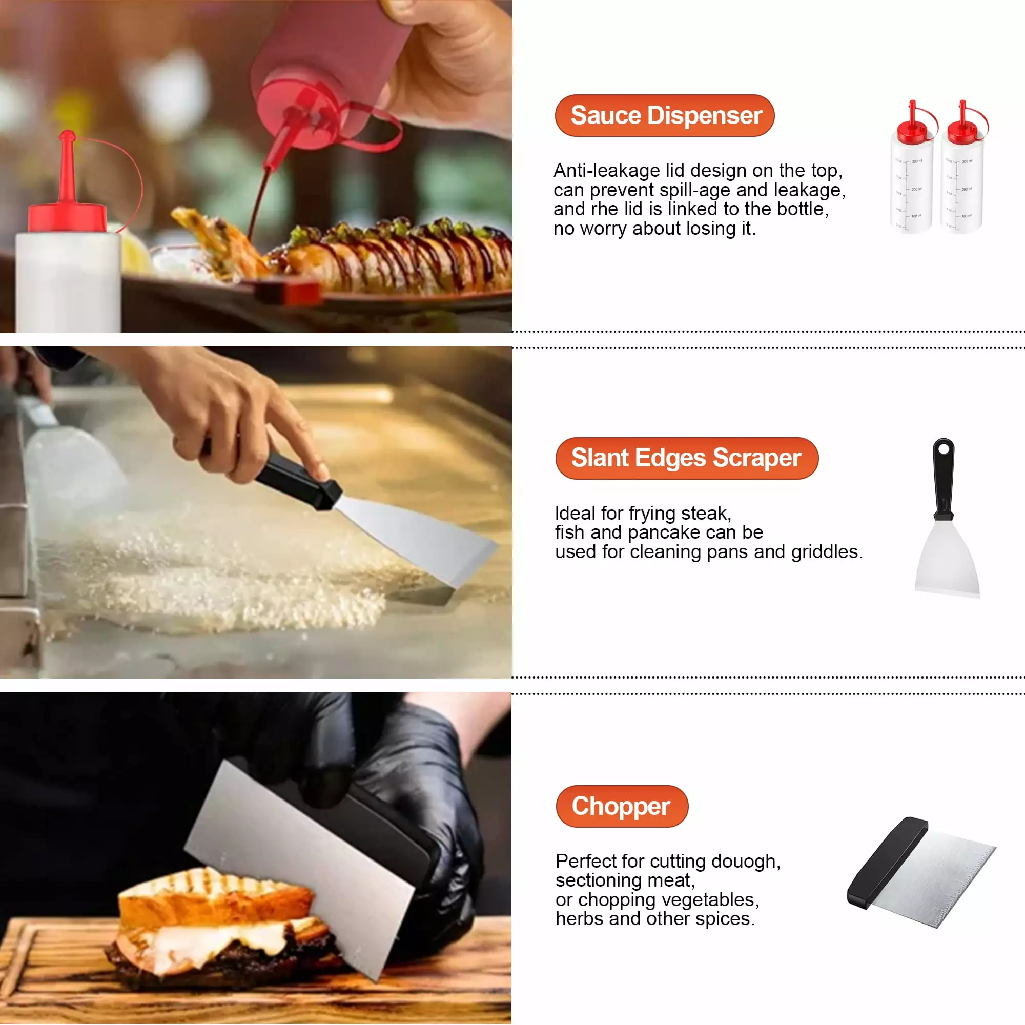 - [Food Grade High-quality Material] All the griddle accessories for blackstone are made of healthy and safe material and totally reach the food safety grade which can contact with the food directly. Also. the durable material makes the service life longer. The stainless steel part is smooth for frying and flattening the food better. The PP material and extra large size handle is non-slip and heat resistant to prevent burns.