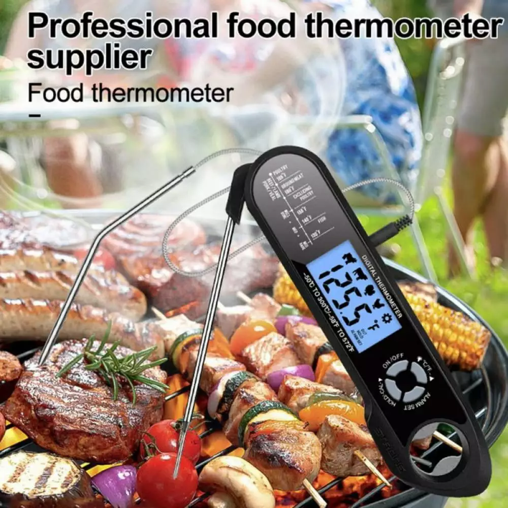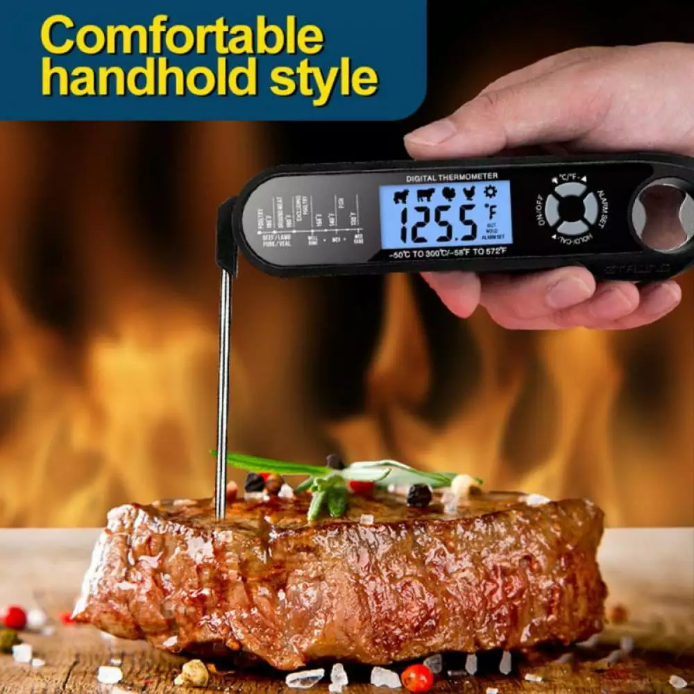 - [POWERFUL FUNCTIONALITY]Switch easily between and H. and the large and bright LCD display with backlight makes it very easy to read the temperature while cooking outdoors on sunny days or at night. Easy to calibrate. comes beautifully packaged in a premium foam lined box. making it an ideal present for any cooking or bbq enthusiast.Also includes 1 extra CR 2450 battery. bonus a meat temperature chart that allows you to effortlessly cook mouthwatering meals