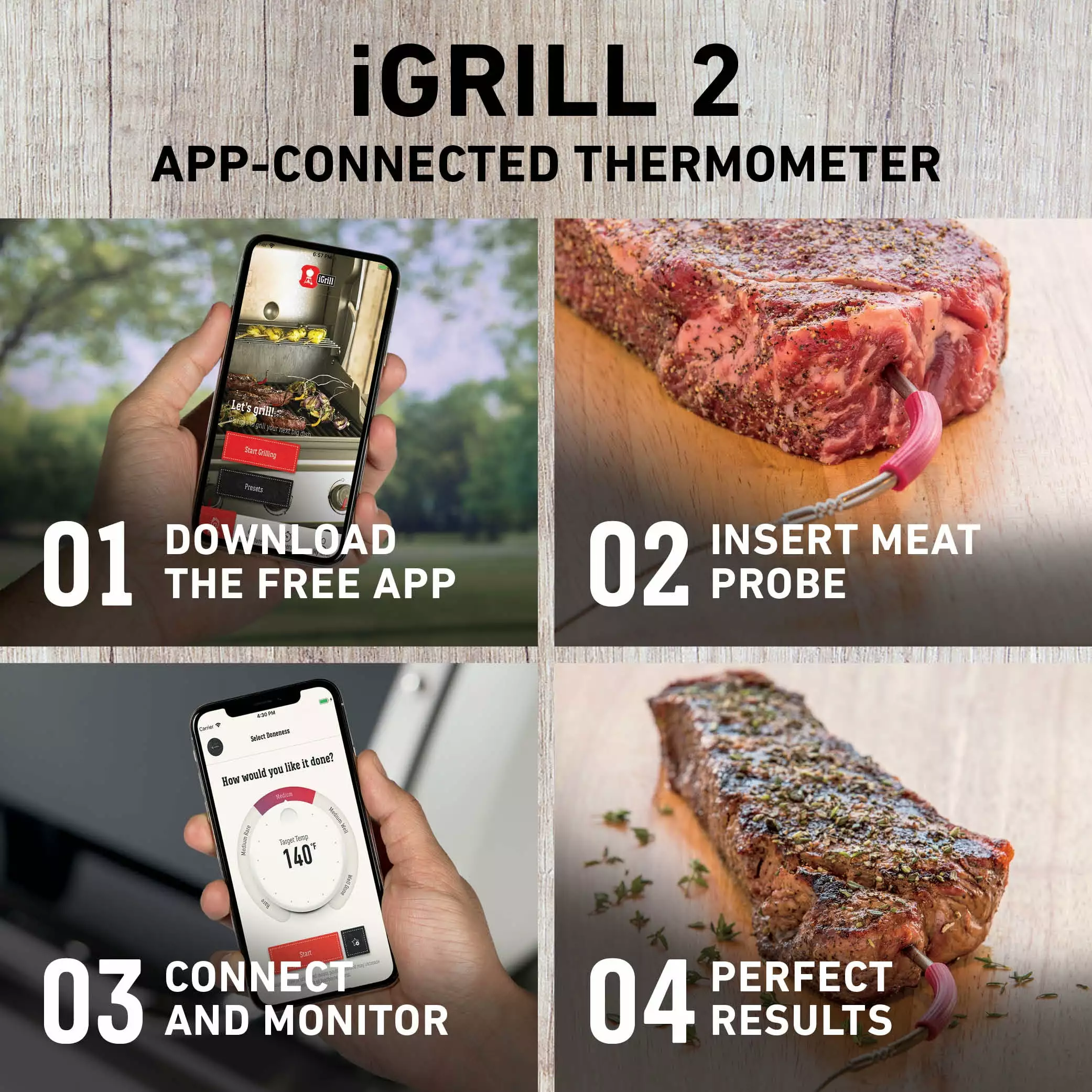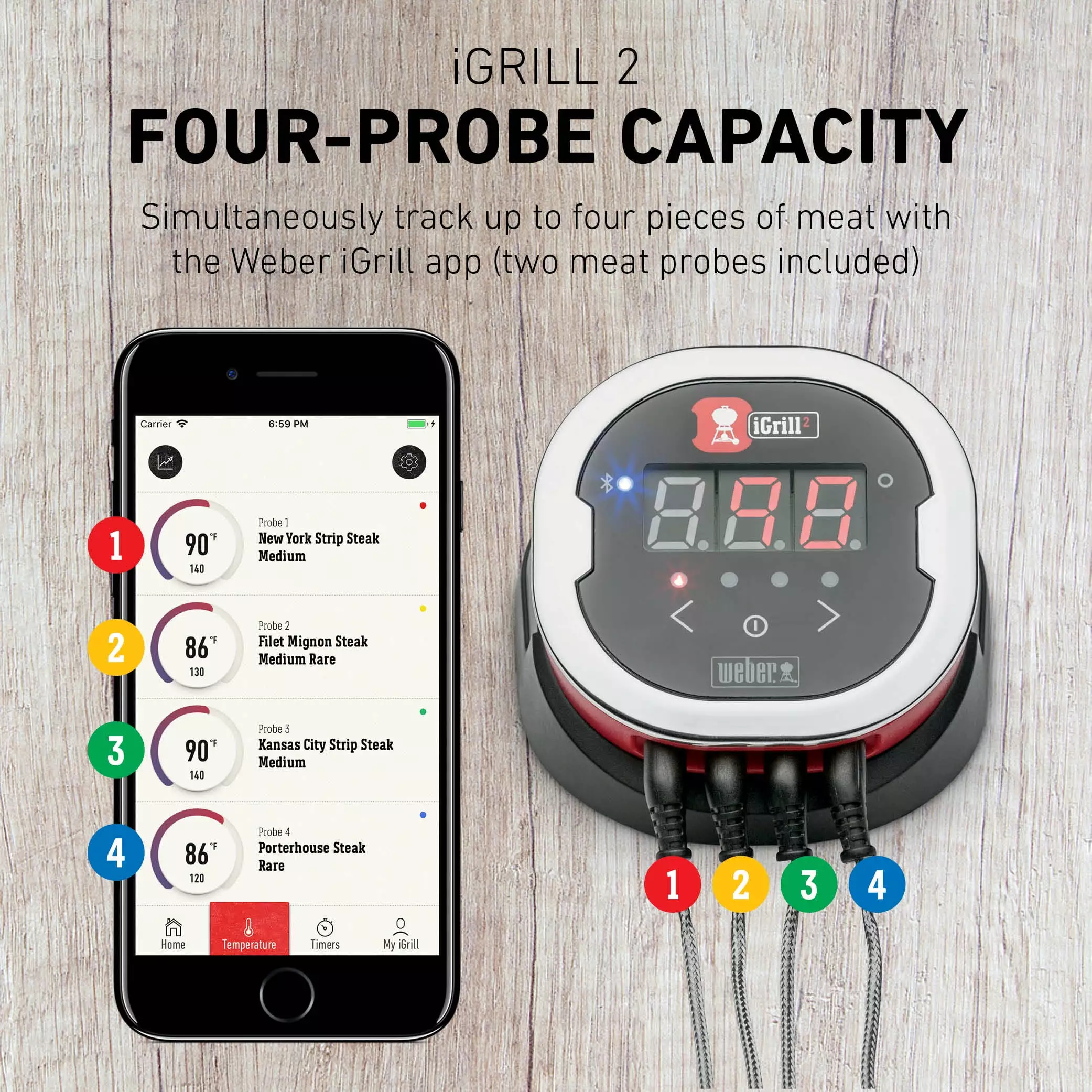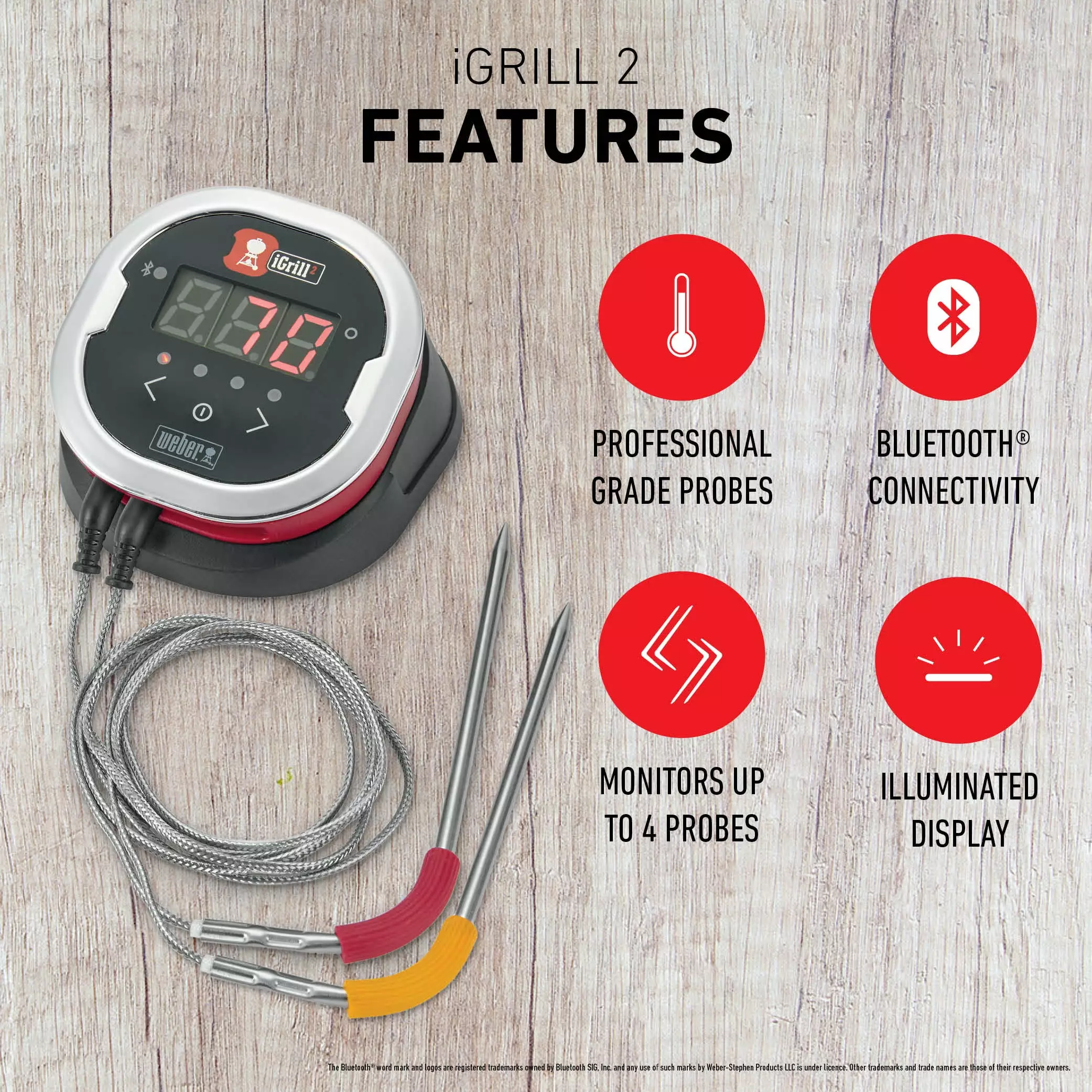 Weber 7203 iGrill 2 Wireless Bluetooth Grill Thermometer With 2 Pro-Meat Probes. 7203. Grill Thermometers. The iGrill2 Smart Grilling Thermometer is the ultimate grilling tool that makes it easy to achieve grilling perfection. Powered by a free iOS and Android app and a wireless Bluetooth Smart connection. knowing exactly when to take your meat off the grill has never been easier. This grilling thermometer includes two. water-resistant. color-coded food probes that can withstand temperatures up to 716 degrees Fahrenheit. Expand both your iGrill2 and your convenience with up to four total food probes. An illuminated display allows you to check the temperature on the iGrill2 whether you are grilling during day or night. and the convenient magnetic mounting lets you place the iGrill2 just about anywhere. You can use the adhesive disc for mounting on non-magnetic surfaces. The iGrill2 has a proximity wake-up. which can intelligently sense when you are too far away from the unit to view the display and goes into a power save mode until you come back into range. With the 150 foot range of the Bluetooth connection. you can keep a close eye on your food while you are inside visiting with guests. watching the game or preparing a side dish. The free Weber iGrill app. available in the App Store or Google Play store. is your central dashboard that monitors the temperature and receives alerts when your food is ready to enjoy. The Weber iGrill App has support for multiple devices. and comes loaded with handy digital grilling tools such as custom alarms. exclusive recipes. temperature graphing and social sharing. The iGrill2 also comes with 2 AA batteries so you can get started right away. Compatible with iPod touch 5th generation and later. iPhone 4s and later. iPad mini. iPad 3rd generation and later. The iGrill2 is also compatible with Android devices running Android version 4. 3 and higher….