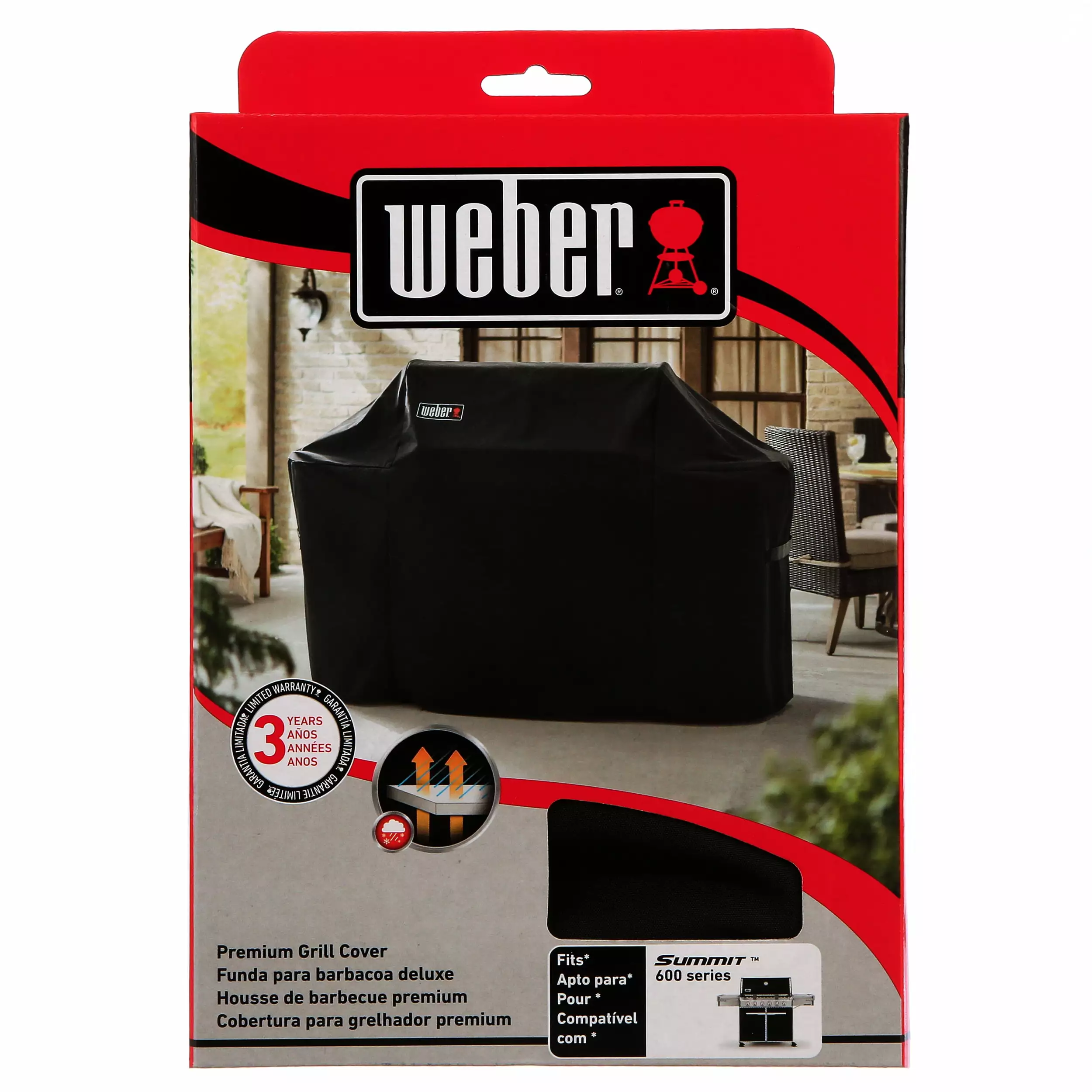 The Summit 600 series gas grill cover is all-weather fabric is waterproof. UV resistant and breathable. Protects grills from the elements and will hold tight with the hook & loop straps preventing the cover from blowing away. Cover can be easily be placed over grill with little effort.