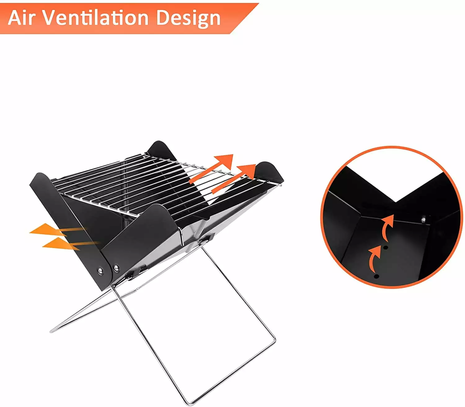 About this item Foldable & Portable: The charcoa grill folding compact but sets up in seconds or less. This barbecue grill is not only foldable. but also small and lightweight. which is particularly easy to carry. It can be folded into ultra-thin. saving space. and it is very suitable for storing this lightweight foldable grill in very small kitchens. trunks. outdoor occasions. or even to put in your bag. as it is easy to carry to anywhere. Excellent Outdoor Tools: Whether tailgating. picnicking. adventuring. or just relaxing at home. this charcoal smokeless barbecue grill is the perfect little grill that provides big results. It can meet your needs for a variety of smoked barbecue to fully enjoy the outdoor cooking unique in the most romantic and original flavor. Air Ventilation Design: With the unique design of air ventilation. it can boost the flowing of air and the burning of charcoal would be incredibly faster. which speeding up your outdoor grill. If times get tough. this charcoal grill is ready to enhance your outdoor cooking. Reasonable Design: This barbecue grill is easy to install and disassemble as no tools are needed while assembling. and it is especially convenient to carry. When the foldable charcoal grill is unfolded. the portable charcoal forms a triangular feet support to maintain stability when used on the ground. The lightweight folding foot design is convenient for transportation and Store. Therefore. you can enjoy the fun of barbecue anytime. anywhere. Easy to Clean: It is very easy to clean the BBQ grill after using it. You can just simple take off the charcoal mesh and give it an omnidirectional cleaning