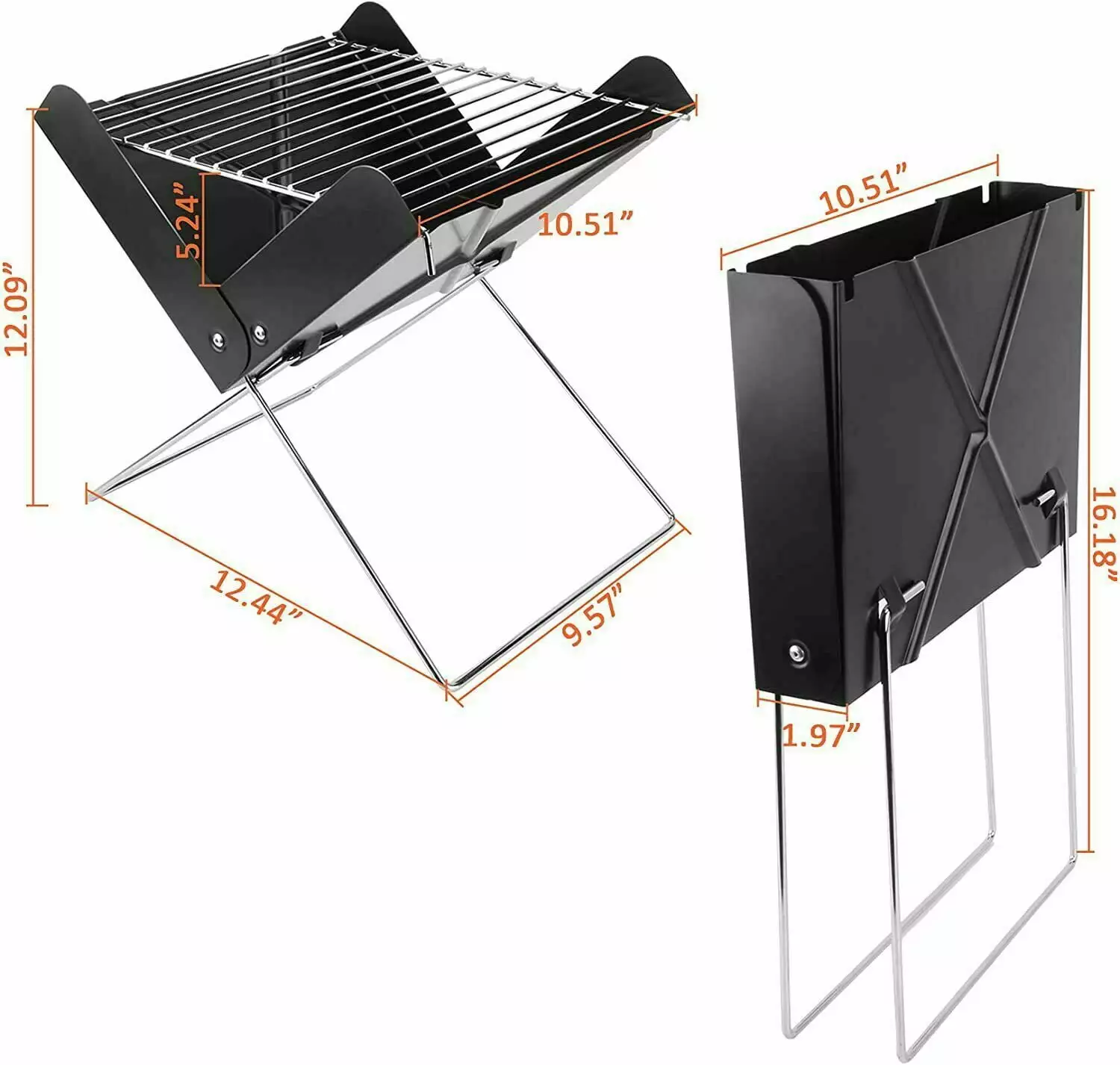 Foldable & Portable: The charcoa grill folding compact but sets up in seconds or less. This barbecue grill is not only foldable. but also small and lightweight. which is particularly easy to carry. It can be folded into ultra-thin. saving space. and it is very suitable for storing this lightweight foldable grill in very small kitchens. trunks. outdoor occasions. or even to put in your bag. as it is easy to carry to anywhere.Excellent Outdoor Tools: Whether tailgating. picnicking. adventuring. or just relaxing at home. this charcoal smokeless barbecue grill is the perfect little grill that provides big results. It can meet your needs for a variety of smoked barbecue to fully enjoy the outdoor cooking unique in the most romantic and original flavor.Air Ventilation Design: With the unique design of air ventilation. it can boost the flowing of air and the burning of charcoal would be incredibly faster. which speeding up your outdoor grill. If times get tough. this charcoal grill is ready to enhance your outdoor cooking.Reasonable Design: This barbecue grill is easy to install and disassemble as no tools are needed while assembling. and it is especially convenient to carry. When the foldable charcoal grill is unfolded. the portable charcoal forms a triangular feet support to maintain stability when used on the ground. The lightweight folding foot design is convenient for transportation and Store. Therefore. you can enjoy the fun of barbecue anytime. anywhere.Easy to Clean: It is very easy to clean the BBQ grill after using it. You can just simple take off the charcoal mesh and give it an omnidirectional cleaningYSSOA 12 Portable Grill Charcoal Barbecue Grill – Folding Grill Notebook Shape Charcoal Grill. Detachable Collapsible. Mini Tabletop Camping Grill BBQ. Black